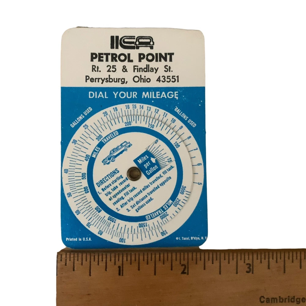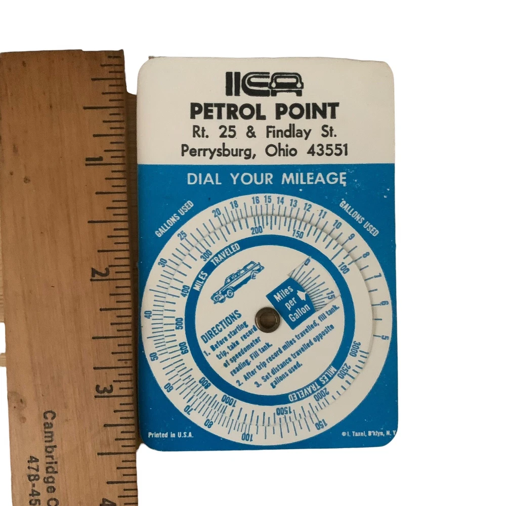 Vintage Petrol Point Dial Your Mileage Calculator Perrysburg OH Gas Station Description: For sale is a vintage Petrol Point “Dial Your Mileage” calculator from Perrysburg, Ohio. This collectible gas station promotional item allows drivers to calculate miles per gallon by aligning miles traveled with gallons used. It features a rotating dial and clear instructions for use. Condition: • Good vintage condition with some signs of age. • Graphics and text remain legible. Great for: • Gas station memorabilia collectors • Vintage car enthusiasts • Retro advertising collectors Ships securely packaged. Feel free to ask any questions!