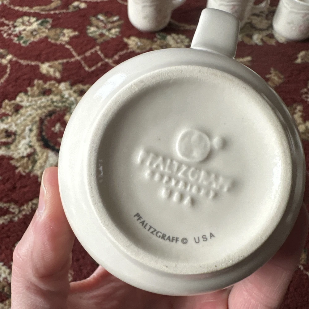 Enhance your morning ritual with this set of 4 vintage Pfaltzgraff Tea Rose pattern stoneware mugs. Each mug showcases a beautiful multicolored Tea Rose design, adding a touch of elegance to your coffee or tea break. The round shape and 3 3/8 inch diameter make them a comfortable fit for your favorite beverage container. Crafted in the United States, these mugs are a testament to classic art pottery techniques, with an impressed backstamp confirming their authenticity. Their sturdy stoneware material and 3 1/8 inch height ensure durability for daily use. Add a piece of history to your table with these original Pfaltzgraff pieces, a true reflection of timeless style and quality.