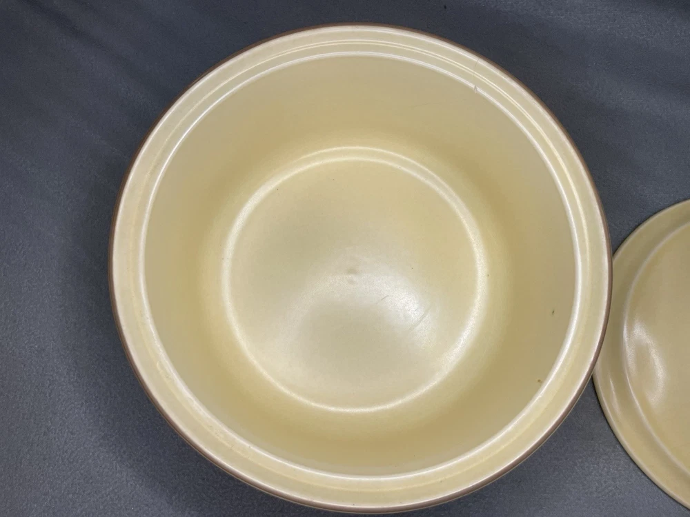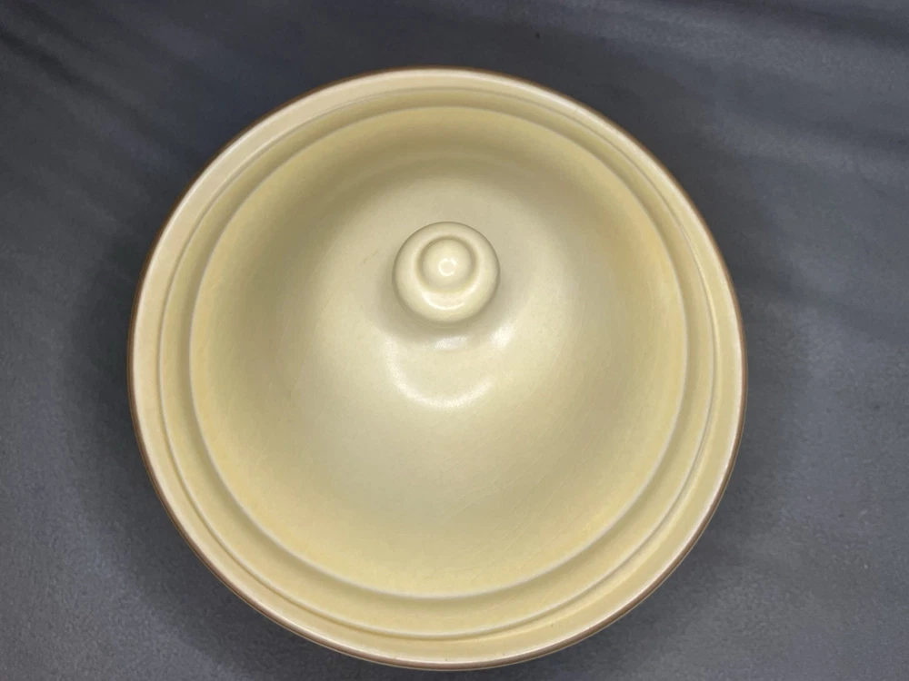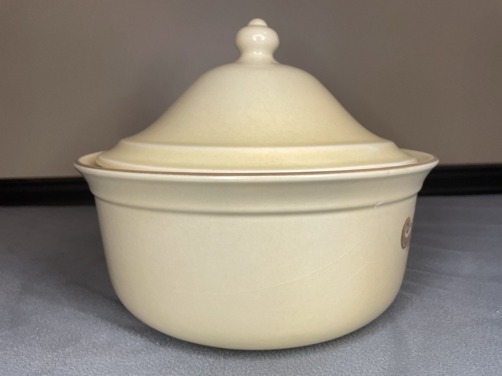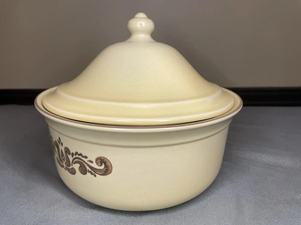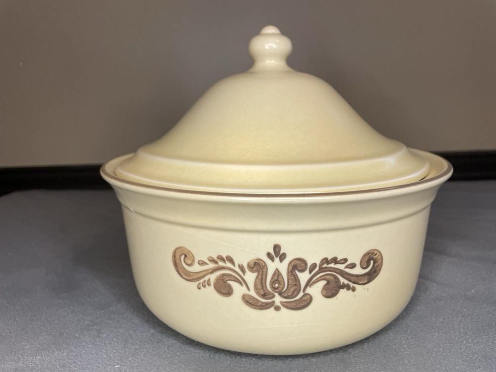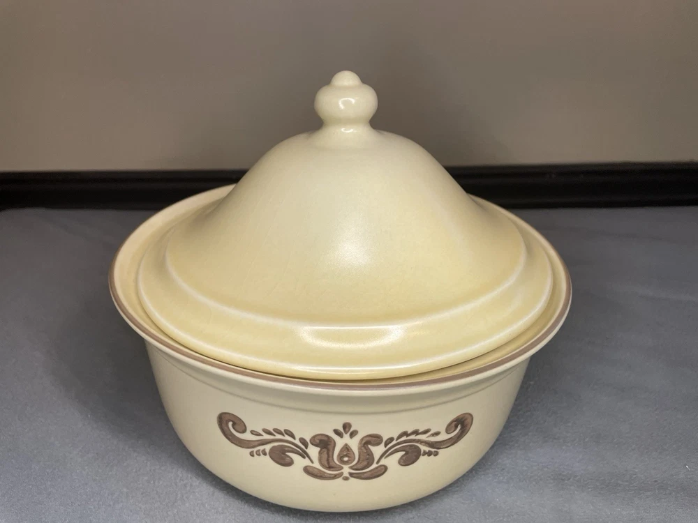 Crafted in 1979, this Vintage Pfaltzgraff Village 2qt Casserole Dish is a charming addition to any kitchen collection. With its warm beige color and classic Village pattern, it evokes a Vintage Farmhouse theme that blends seamlessly with modern aesthetics. The round, 9-inch diameter dish, accompanied by a matching lid, has a capacity of 2 quarts and is ideal for oven and microwave use. This original stoneware piece, made in the United States, features a single compartment to keep your culinary creations organized. Its durable material ensures lasting functionality, while the impressed backstamp authenticates its vintage status. Whether for everyday use or special occasions, this Pfaltzgraff casserole dish is a testament to timeless style and utility. Please inspect photos carefully as there is a chip and crazing
