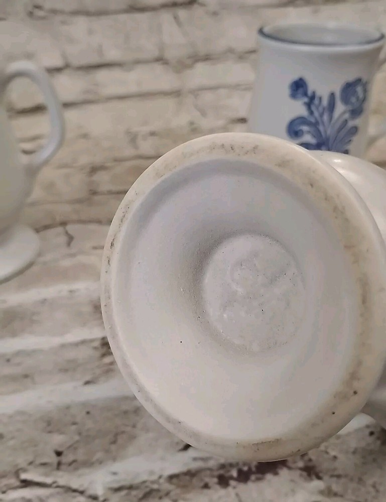 Add a touch of vintage charm to your mug collection with this set of four Pfaltzgraff Yorktown footed mugs. These stoneware mugs feature a beautiful blue floral pattern and have a capacity of 6 oz. The mugs measure 4-7/8" in height and have a diameter of 3". Perfect for all occasions, these mugs are a great addition to any decorative cookware, dinnerware, or serveware collection. The set includes three mugs and is an original, licensed reproduction from the United States. The backstamp is impressed with the brand name "Pfaltzgraff" and the item is categorized under Pottery & Glass, Decorative Cookware, Dinnerware & Serveware, and Mugs.
