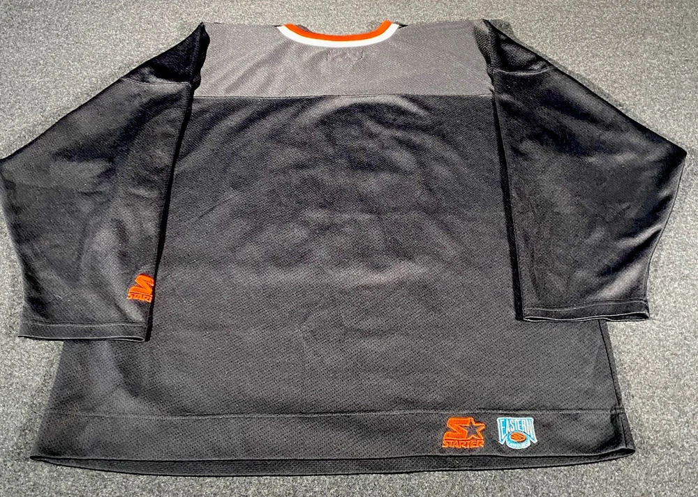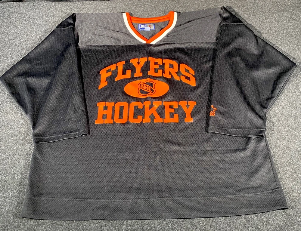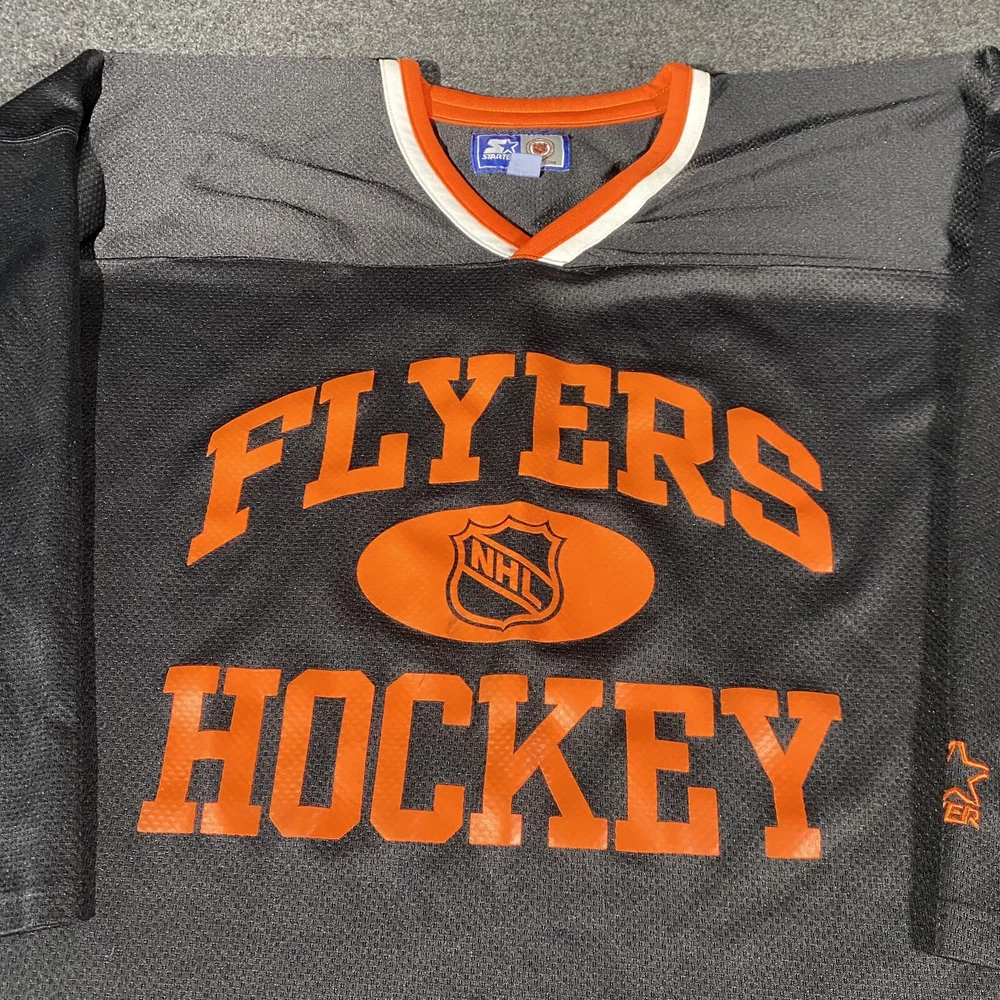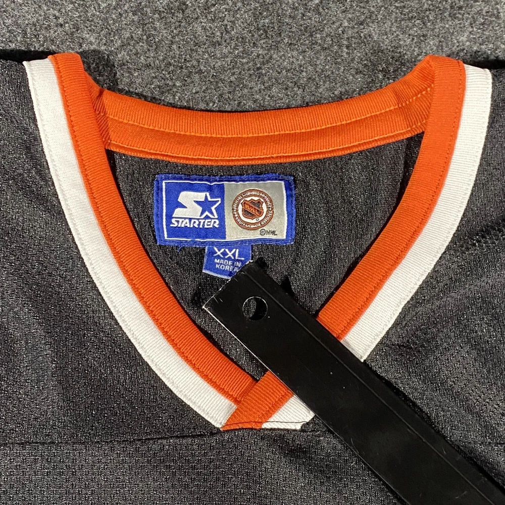 Show your love for the Philadelphia Flyers with this vintage Starter jersey from the 90s. Featuring the iconic black color and the team's logo on the chest, this jersey is perfect for any Flyers fan. It is an officially licensed NHL product and perfect for wearing during the regular season. The jersey is a size 2XL and in great condition. It has been well-maintained and is perfect for any collector or fan. Add this to your collection today and represent the Flyers with pride.