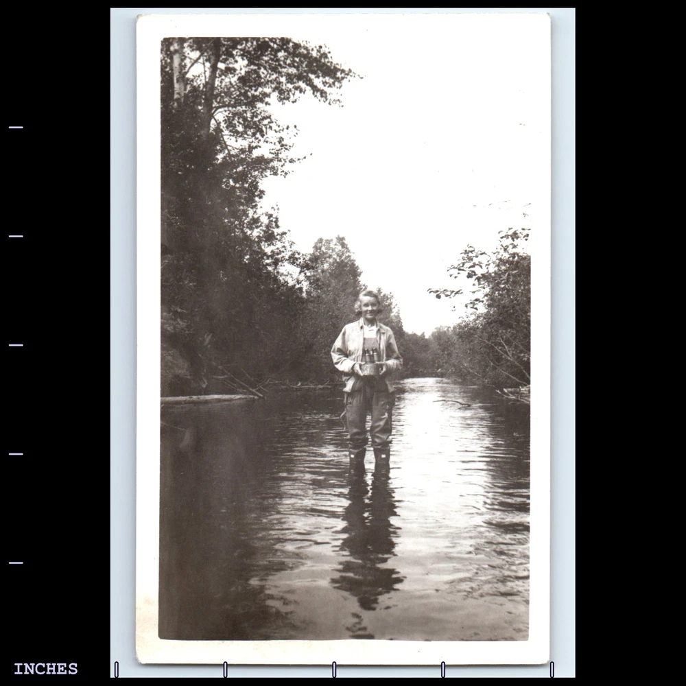 Vintage Photo WOMAN STANDING IN RIVER WITH BINOCULARS BIRD WATCHING
