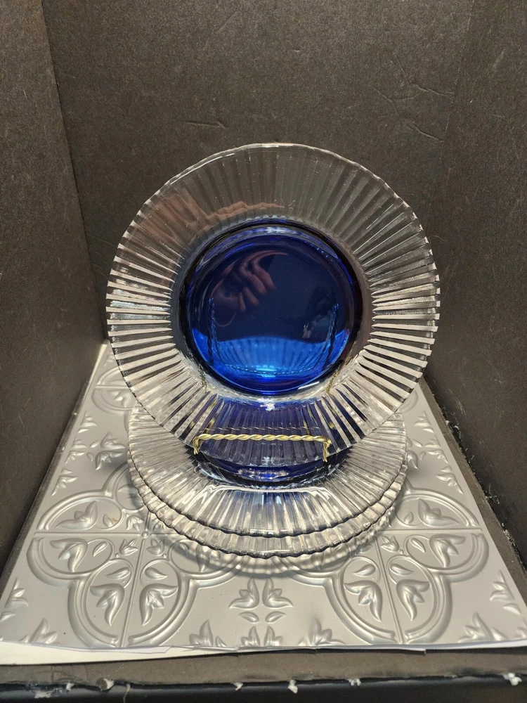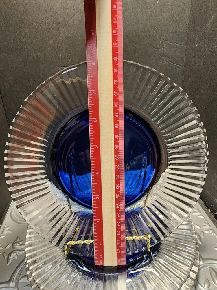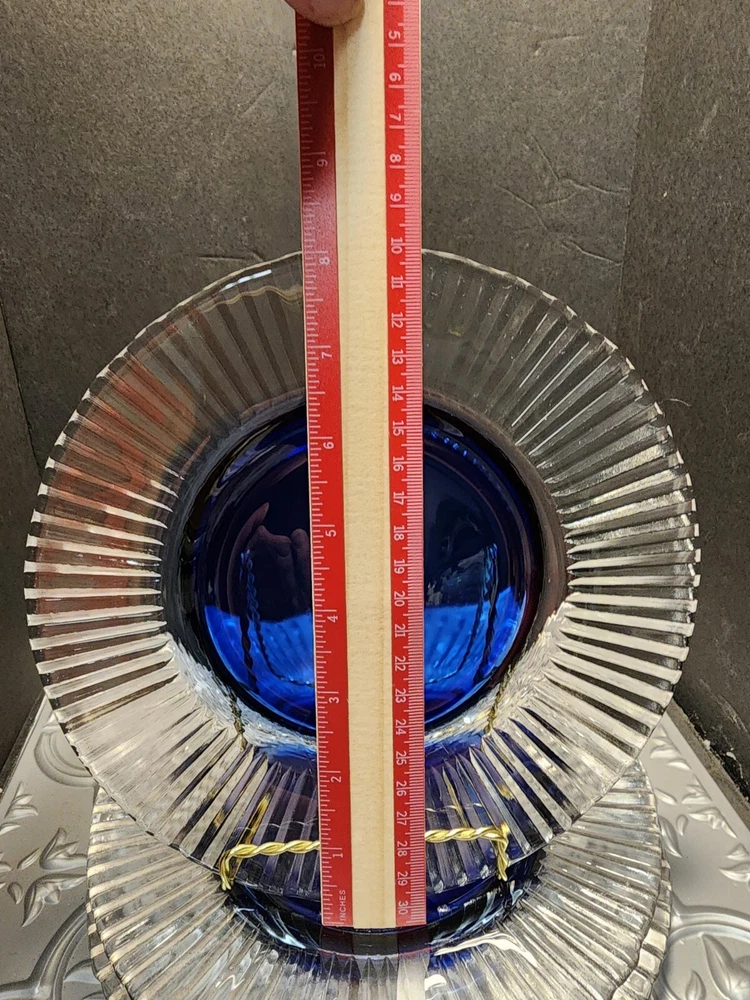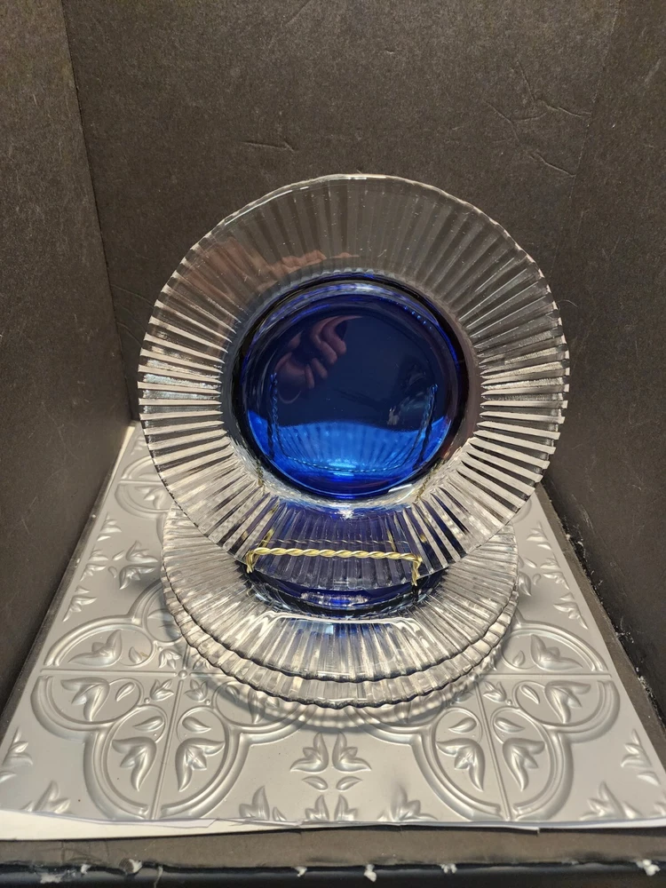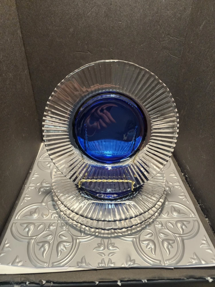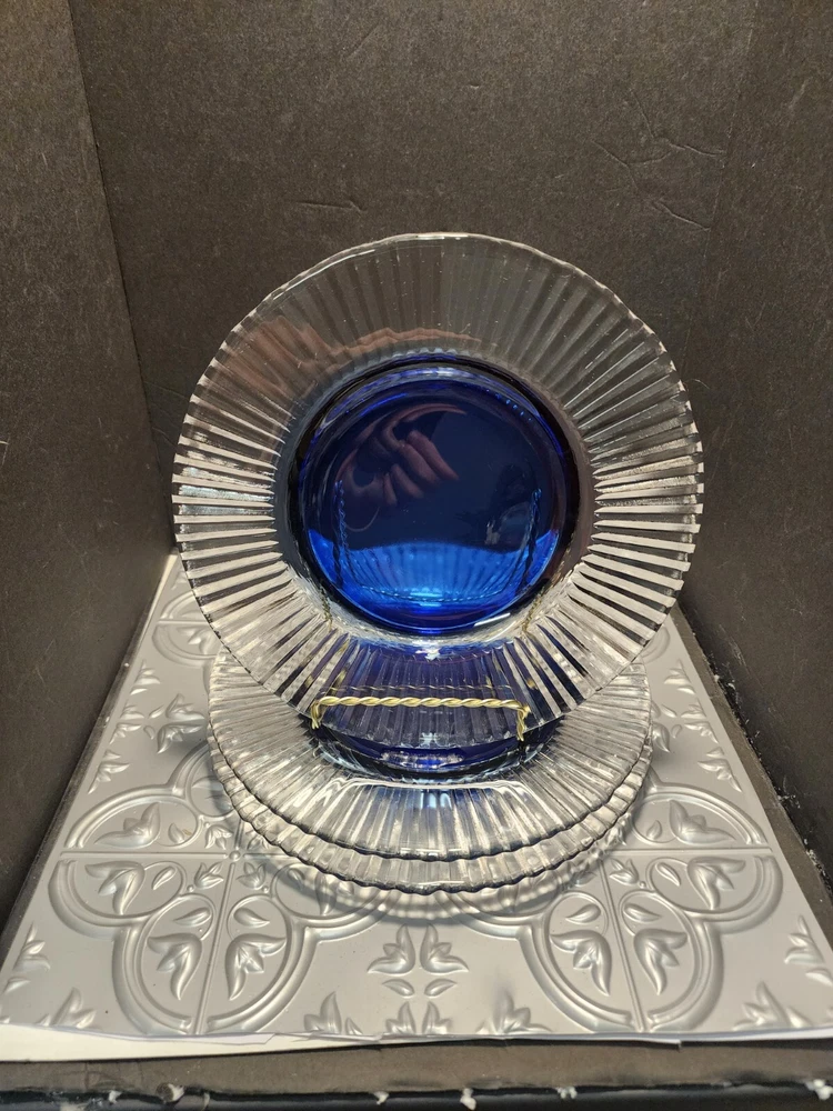 Add some vintage charm to your dining table with this set of 3 Pier 1 ribbed glass plates. These plates feature a beautiful cobalt blue center that adds a pop of color to any meal. Measuring 8.25 inches in diameter, these plates are perfect for serving small to medium-sized dishes. Crafted from high-quality glass material, these plates are durable and long-lasting. The ribbed design adds a touch of elegance, making these plates suitable for formal occasions or everyday use. Whether you're hosting a dinner party or enjoying a meal with your family, these vintage Pier 1 glass plates are a great addition to your collection.