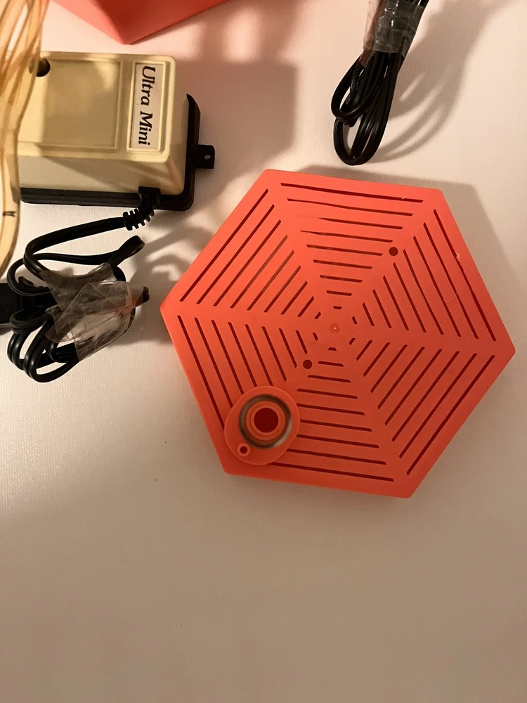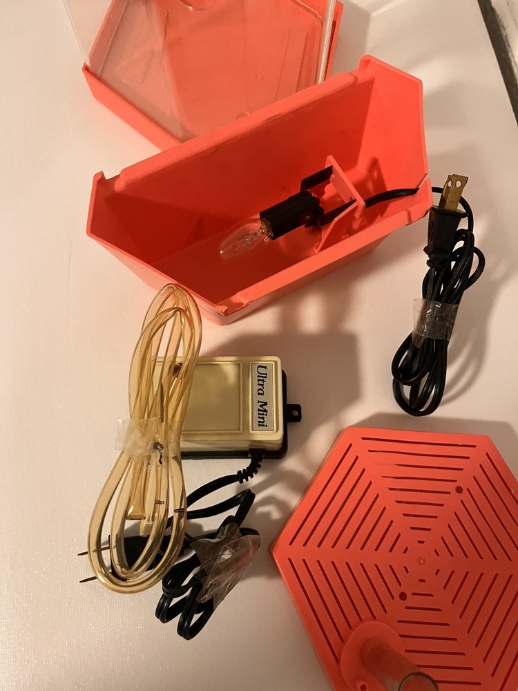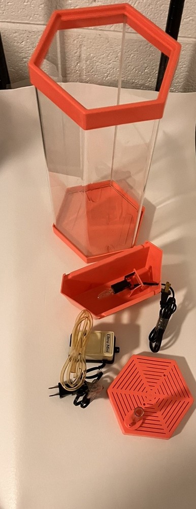 Open box works great everything this is the pink one from 1983 The Vintage Designer HEX Aquarium #2800ds Pink Hexagonal Decor Fish Tank is a unique and stylish mini aquarium designed by the brand Designer Hex. This retro-inspired fish tank features a hexagonal shape, a tank capacity of 3 gallons, and a tank width of 7 inches. Made of acrylic, this aquarium is perfect for fish lovers looking to add a touch of nostalgia to their home decor. Designed and manufactured in the United States, this one-of-a-kind tank is sure to stand out in any living space.