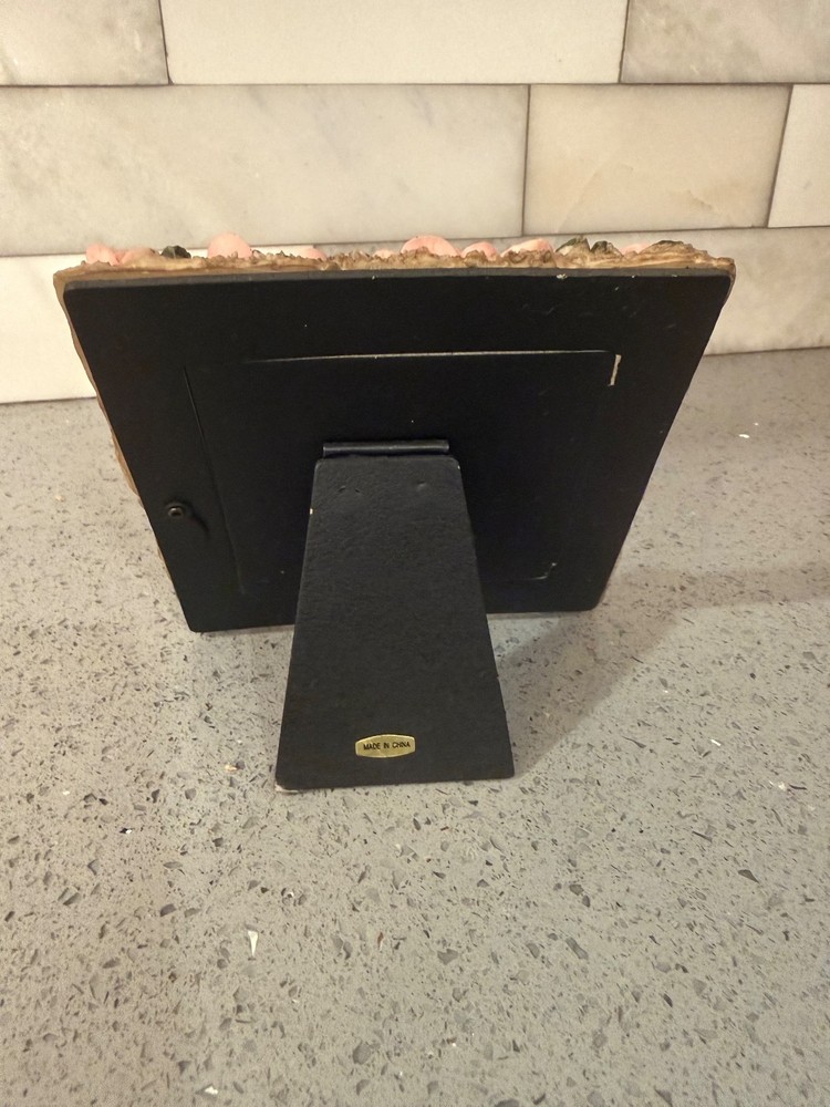 Add a touch of romantic vintage charm to your decor with this adorable ceramic photo frame covered in delicate 3D pink roses! This sweet square frame features dozens of hand-applied pastel pink roses with swirled centers, clustered all around the border and interspersed with green leaves for a lush, garden-inspired look. The three-dimensional roses give it amazing texture and depth—perfect for shabby chic, cottagecore, granny chic, or romantic nursery/vanity displays. - Overall dimensions → approximately 5" x 5" (outer); ideal for a small 2.5" x 3.5" wallet photo, 3" x 3" square, or even a pressed flower/art card (glass and backing included, easel stand on back for tabletop display). - Material → Ceramic/resin with a soft matte/glossy finish. - Condition → Excellent vintage condition—no chips, cracks, or major flaws; minor wear adds to the authentic retro appeal. Thrift-found gem, gently cleaned and ready for your favorite photo or keepsake! From the 1980-90s giftware era (similar to popular Chinese/Taiwan imports of the time), this frame screams nostalgic femininity and is hotter than ever in today's cottagecore trend. Ships carefully packaged to arrive safely. Feel free to message with questions—happy to send more photos! 🌸🖼️