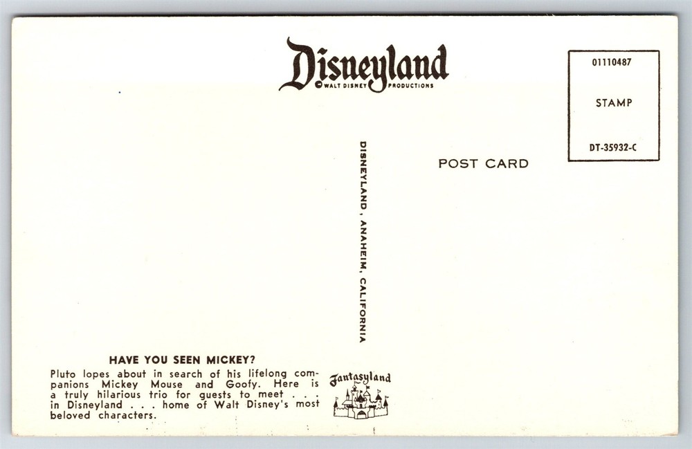 Pluto At Disneyland Magic Kingdom Anaheim CA Postcard J9 Thank you for visiting! This is a standard size postcard, 3.5" X 5.5". In stock, usually ships within 24 hours of your purchase. Please ask questions if you are unsure about anything. Our goal is for your complete satisfaction with the postcard and your experience. Check all my other listings in my store. RETIREDWITHBOOKS Powered by SixBit's eCommerce Solution