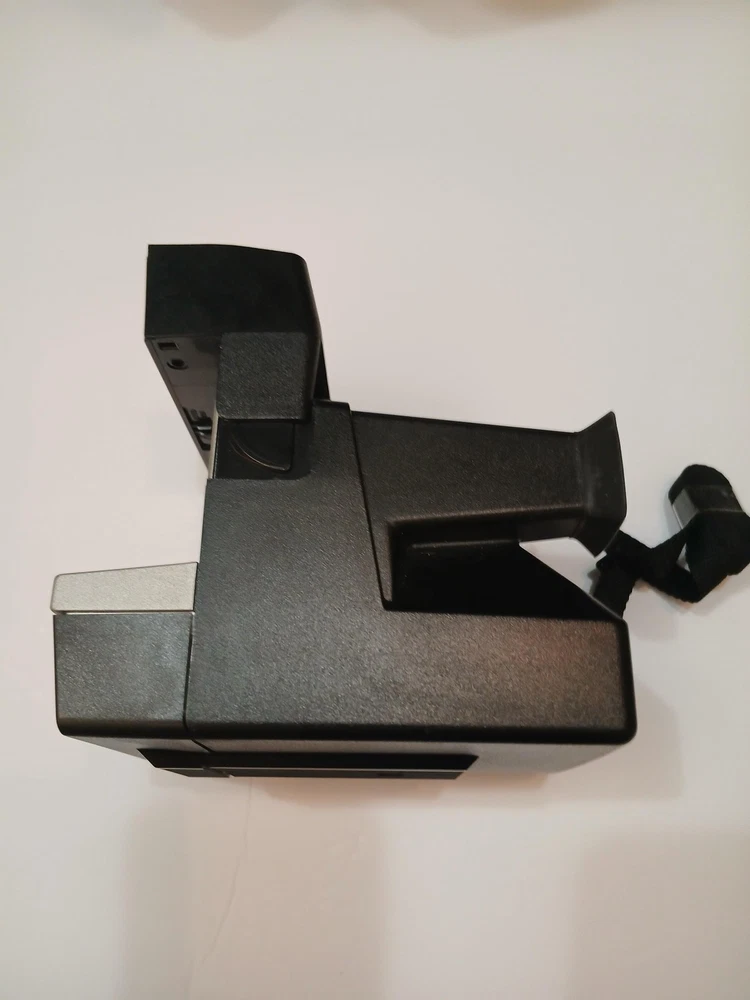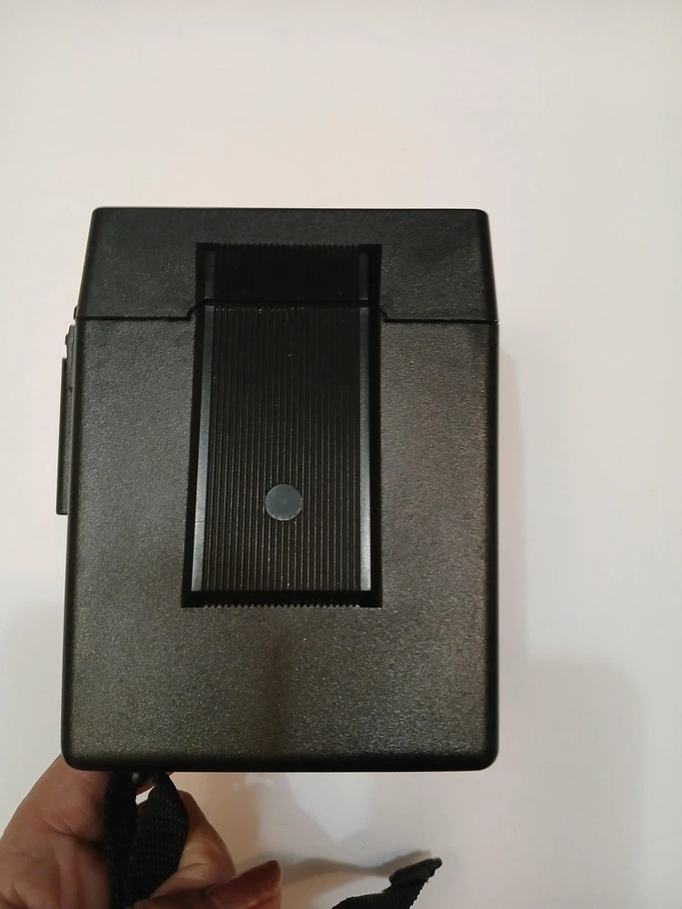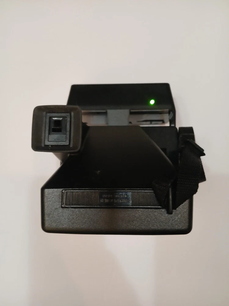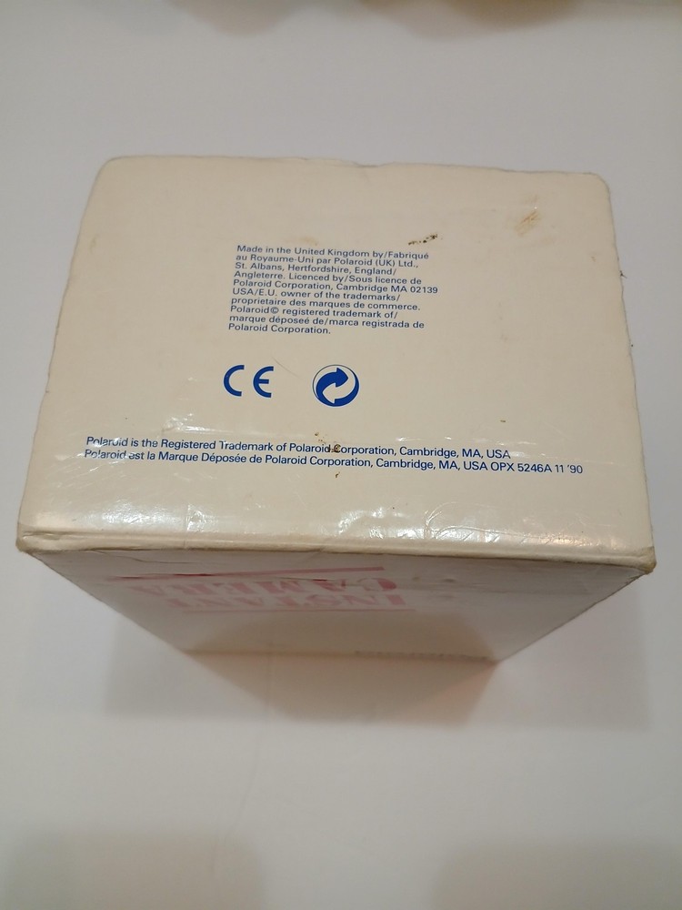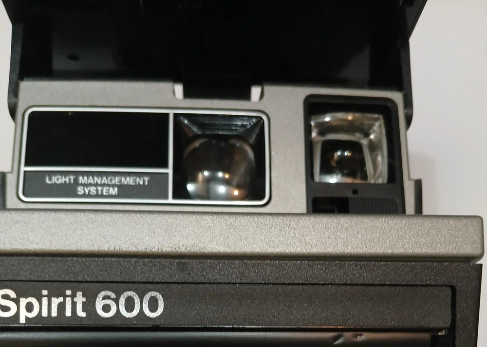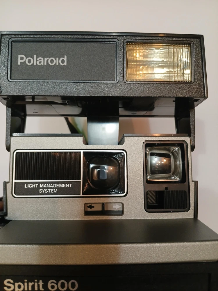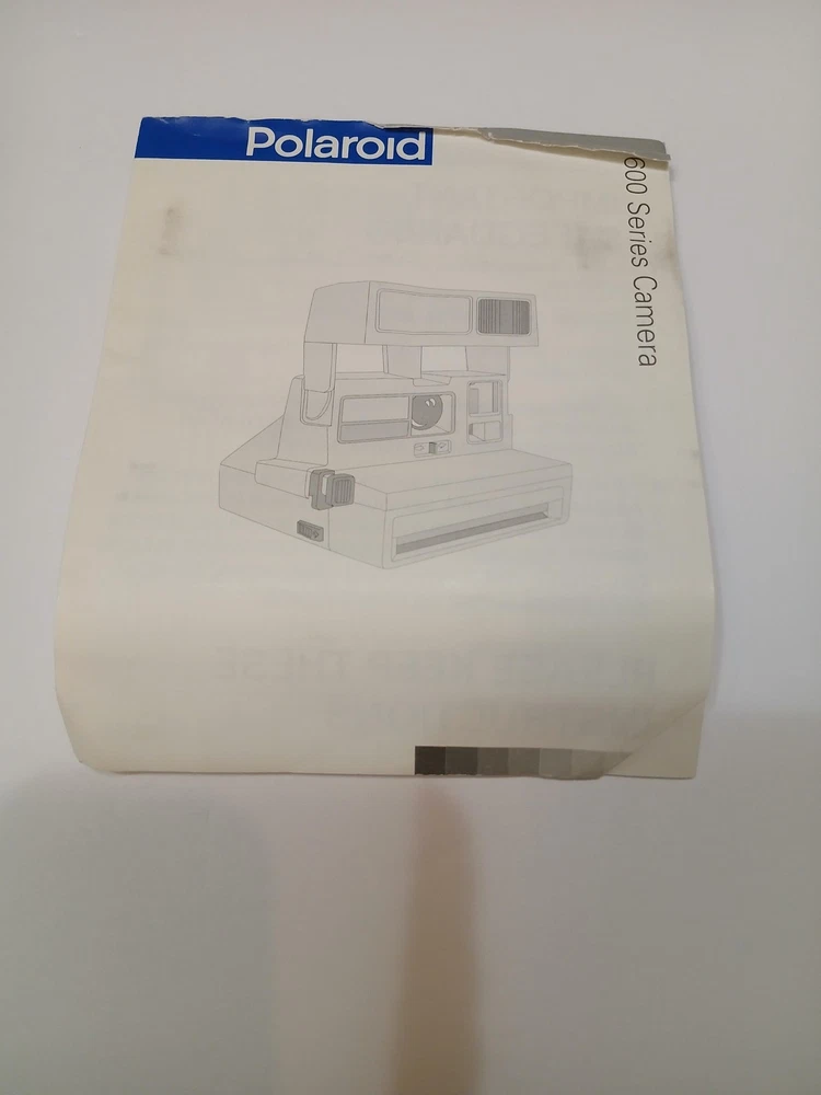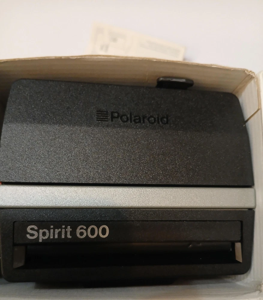 Brand: Polaroid Model: Spirit 600 instant camera from the Polaroid 600 Series. Type: Vintage instant film camera designed for Polaroid 600 integral film packs. Color: Black and silver finish with built-in flash and Light Management System front controls. Manufactured in the United Kingdom by Polaroid (UK) Ltd., licensed by Polaroid Corporation, Cambridge, MA, USA (per box text). Approximate era: early 1990s based on packaging markings. Included: Spirit 600 camera body with attached strap, original Polaroid "Instant Camera" box, and Polaroid 600 Series Camera instruction leaflet. Details: Folding box-type body, integrated electronic flash, front shutter release button, light/dark exposure slider, optical viewfinder, and front film ejection slot labeled "Spirit 600." No UPC, EAN, or ISBN code is visible on the box or manual. Actual film and film-pack battery are not included; the camera operates with standard Polaroid 600 film packs that contain their own battery. Special notes: green power/ready indicator light illuminates during basic testing (see photos).