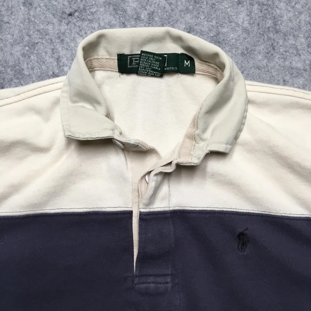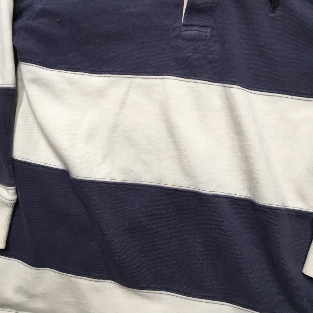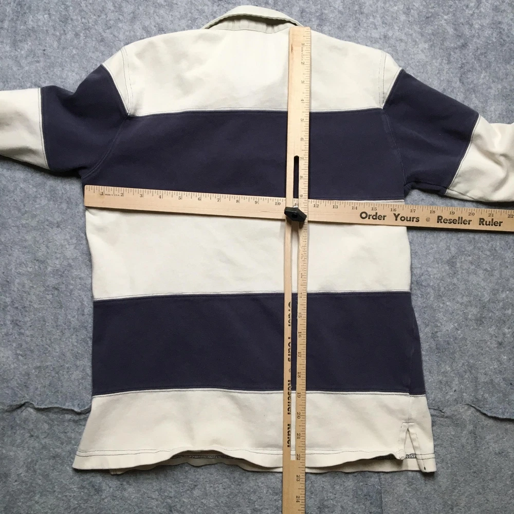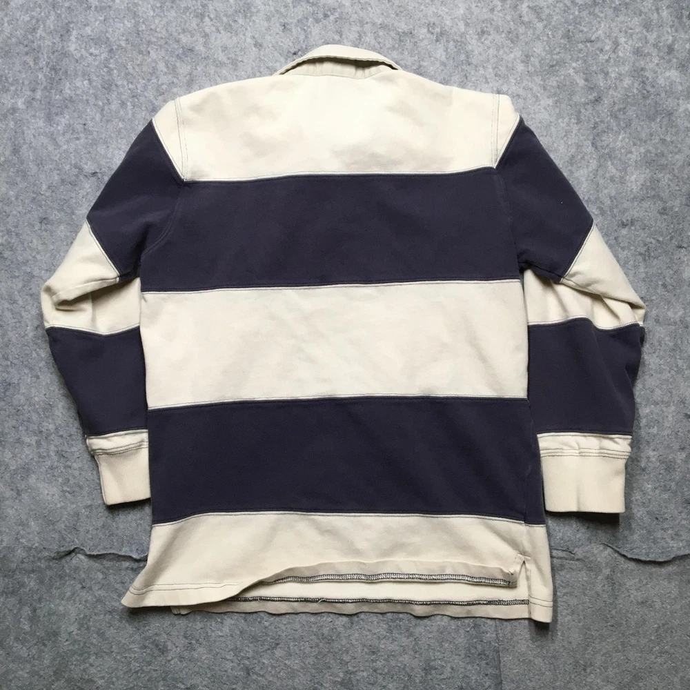 Brand: Polo by Ralph Lauren Style: Youth boys long sleeve rugby polo shirt with wide horizontal stripes and a collared neckline. Color: Navy blue and cream stripe pattern (multicolor). Size: Youth Medium (tag size M). Material: 100% cotton heavyweight knit fabric. Details: Embroidered polo player logo at left chest, partial button placket, ribbed cuffs, side vents at hem, and straight bottom hem. Country of origin: Made in Macau with fabric and care information on interior tag. Add a second (or more) item to your cart from my store to receive a discount on your order! [does not apply to orders made with Best Offer] (shown in cart) Shipping is a non-negotiable flat rate based on size and weight. Each additional item is only $2 more in shipping. Please message me with any questions. I accept free returns for any reason within 60 days of delivery date, including "Does not fit" and "Just didn't like". Please note original shipping may be withheld in certain situations. Items are shipped from a smoke-free home and washed with Free & Clear detergent (except Dry Clean Only items). US Seller. Please message me with any questions! Items shipped within 1 business day (unless there is a vacation note).