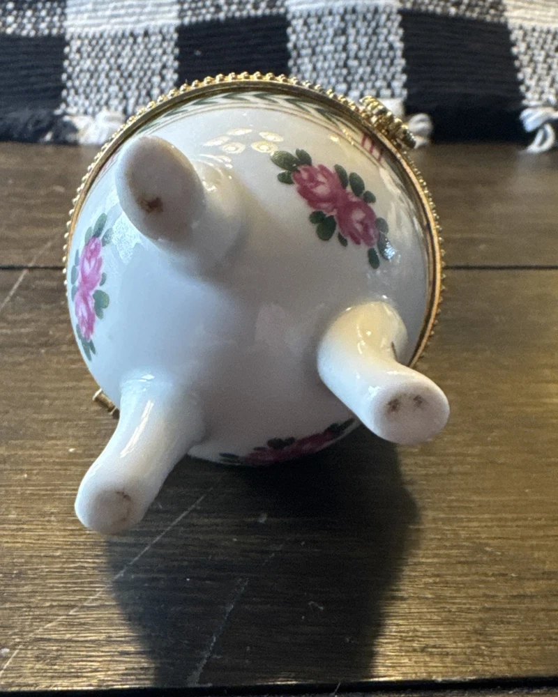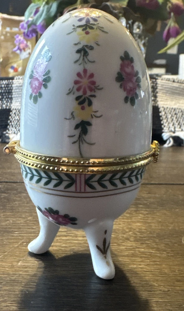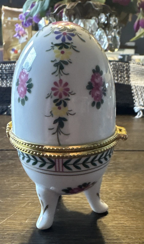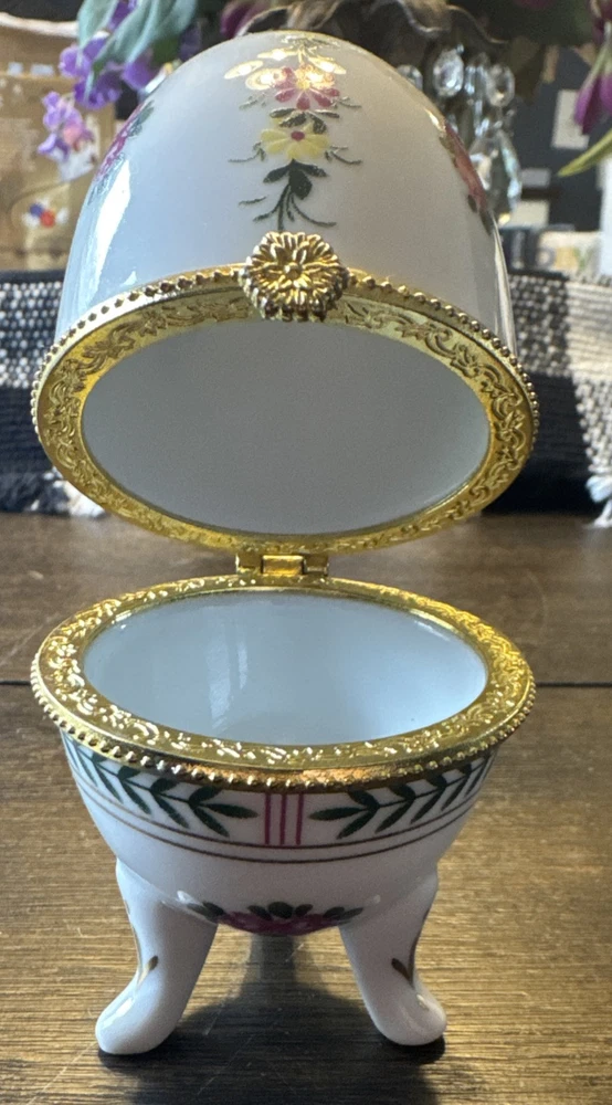 Vintage Porcelain Egg Trinket Box - 4" Tall, Floral Hinged, Three Footed Gold