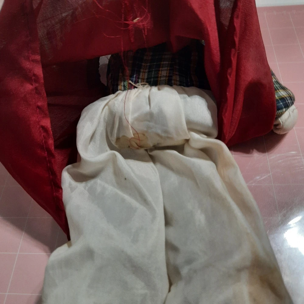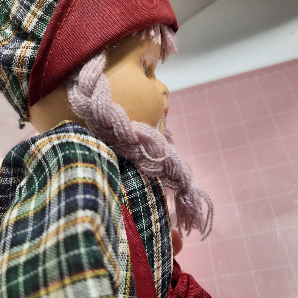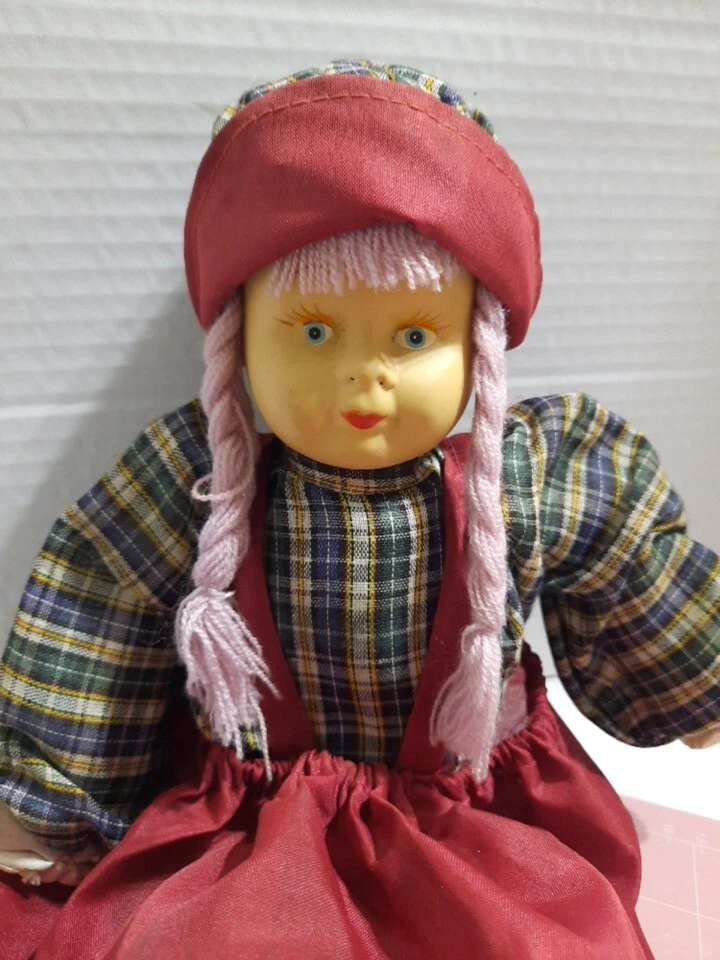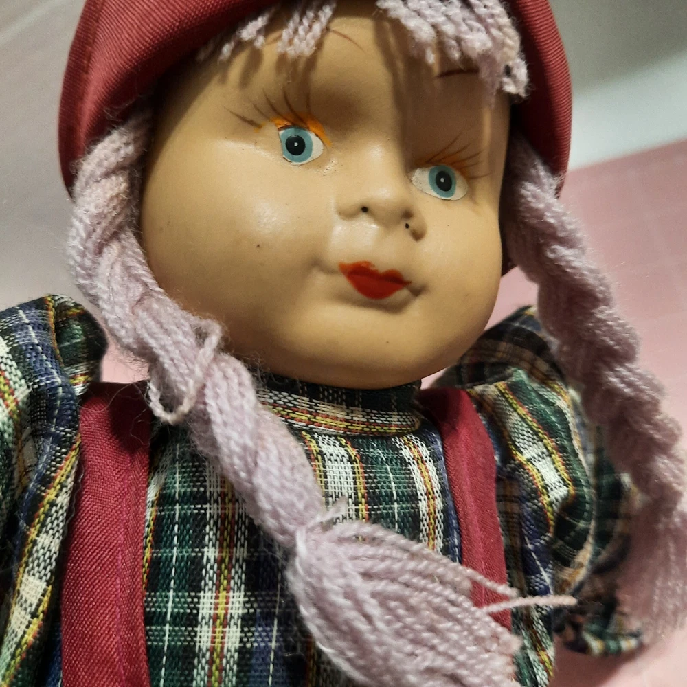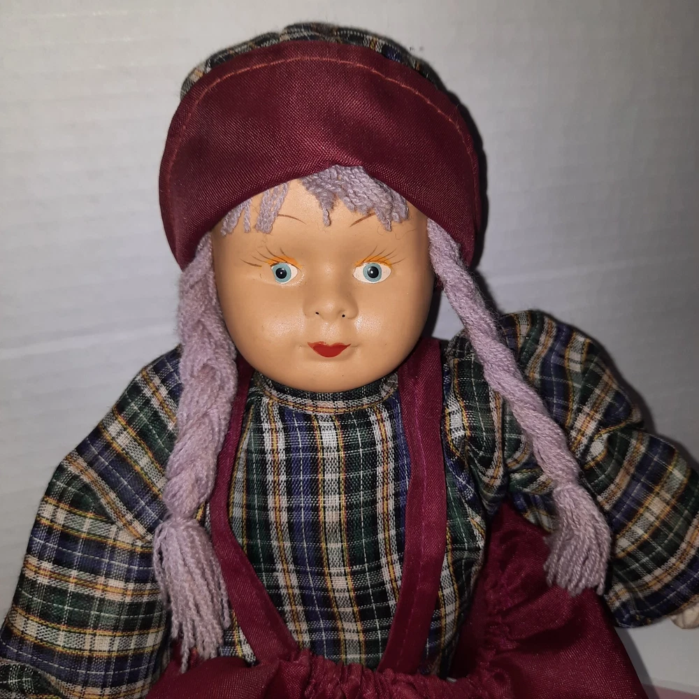 This beautiful vintage porcelain faced doll with purple yarn hair is a single unit antique collectible. The doll is 17 inches in size, with a girl doll gender and Caucasian ethnicity. Its blue eyes complement its light complexion and soft body features. The doll is sold without packaging, but its quality speaks for itself. This porcelain face doll is perfect for collectors or those who appreciate the beauty of antique dolls. Its straight hair and porcelain material make it a unique piece that is sure to impress. This doll is not just a collectible, but also a charming addition to any collection.