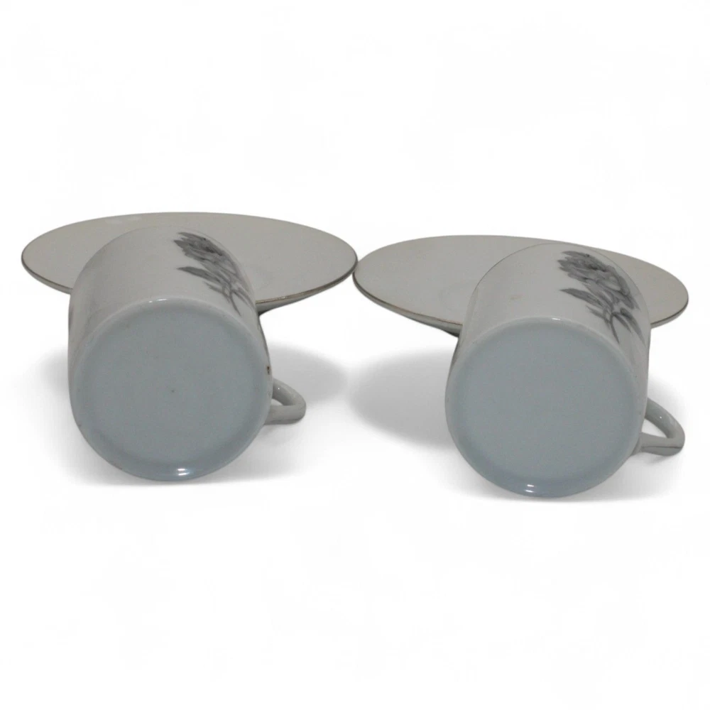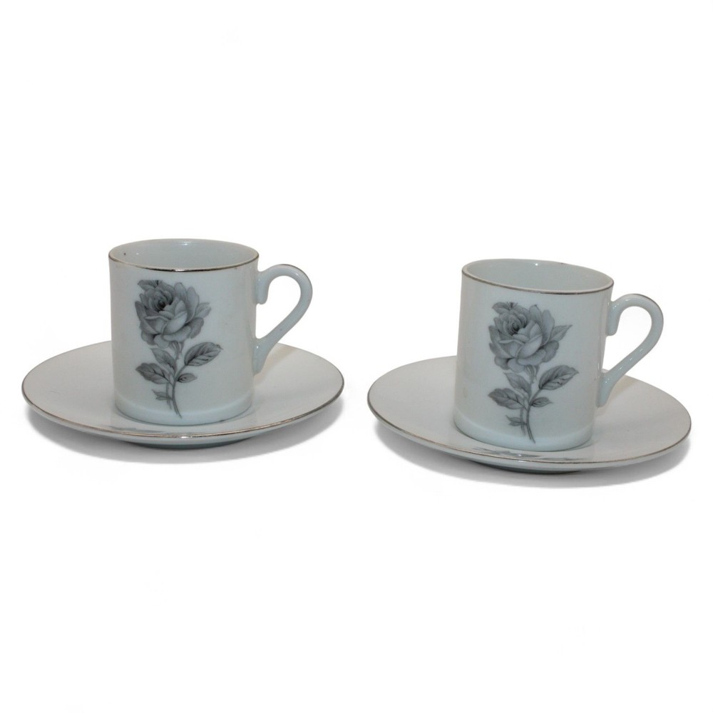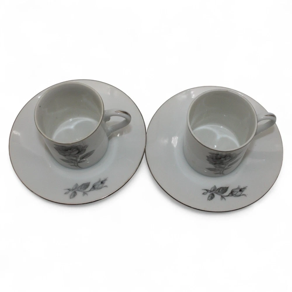 Vintage Porcelain Gray Rose Design Espresso Cups & Matching Saucers Set Of 2