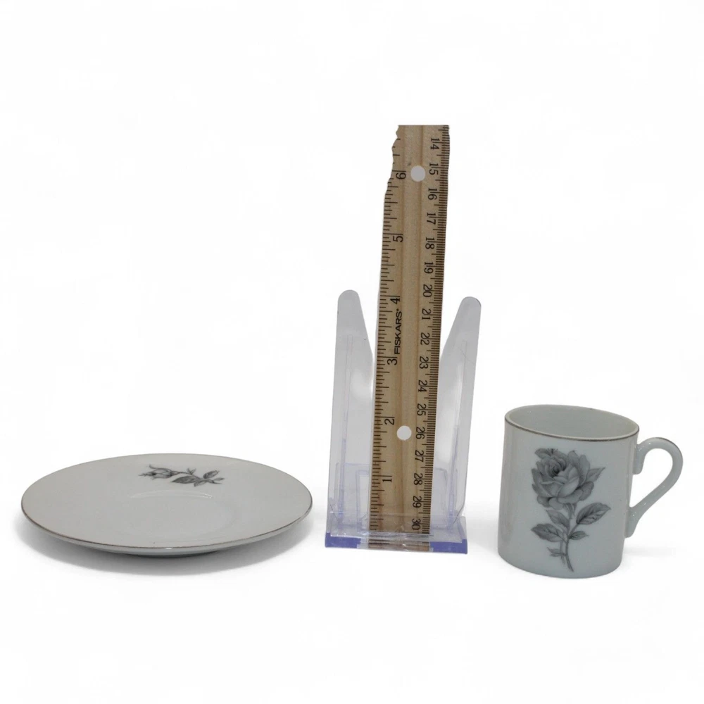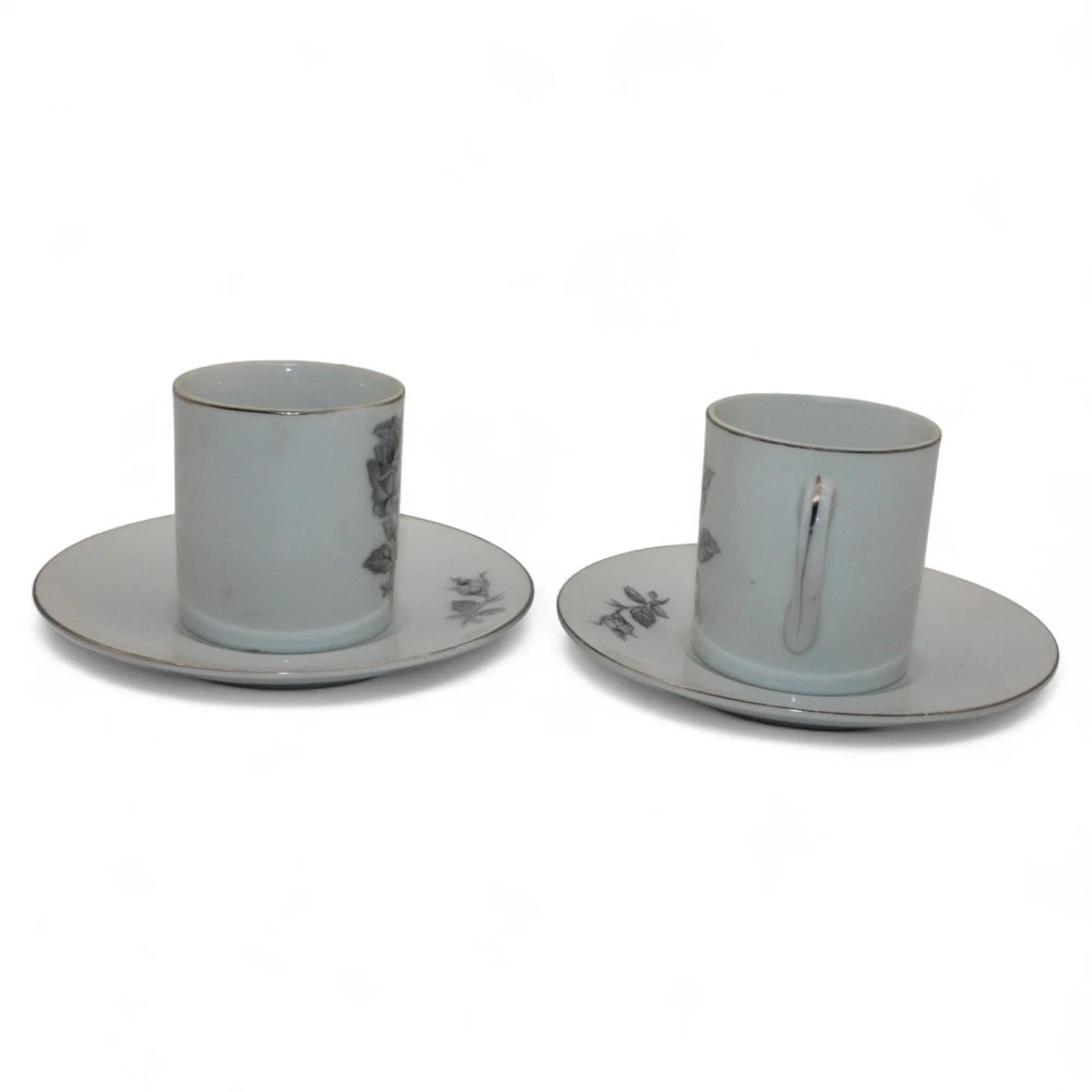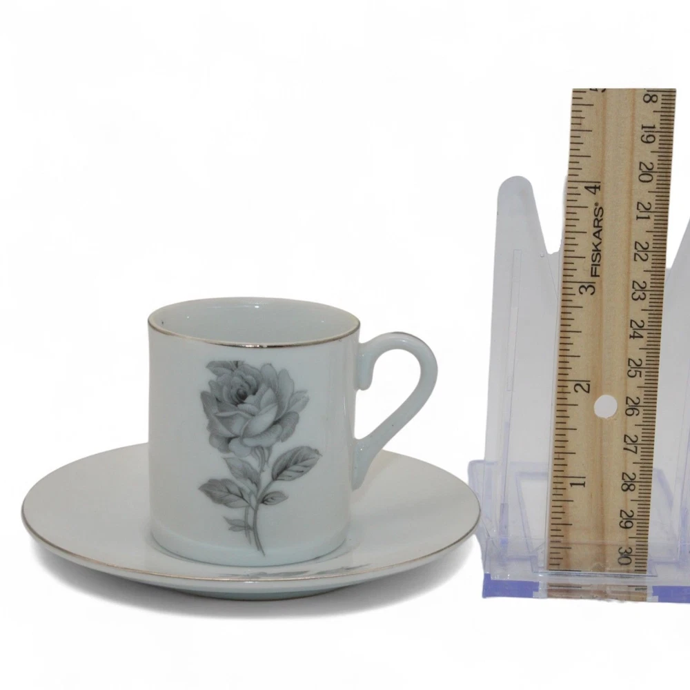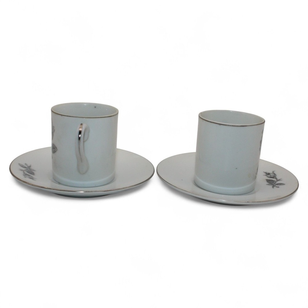 Vintage Porcelain Gray Rose Design Espresso Cups & Matching Saucers Set Of 2
