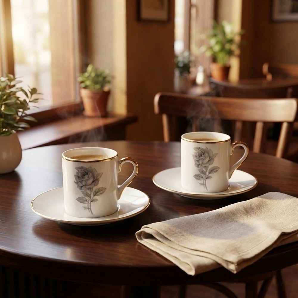 Style: Turkish Colour: Light Pink Type: Espresso Cup & Saucer Set gtin13: Does Not Apply Seller Notes: “Minor wear on gold trim consistent with vintage age.” Material: Porcelain UPC: Does Not Apply Color: White Country of Origin: China Personalize: No Set Includes: Espresso/Demitasse Cup, Saucer, Espresso Cup Brand: Al Baik Number of Items in Set: Four-Piece Service For: 2 Theme: Floral, Floral & Garden Pattern: Floral Suitable for: Unisex Occasion: All Occasions Shape: Round