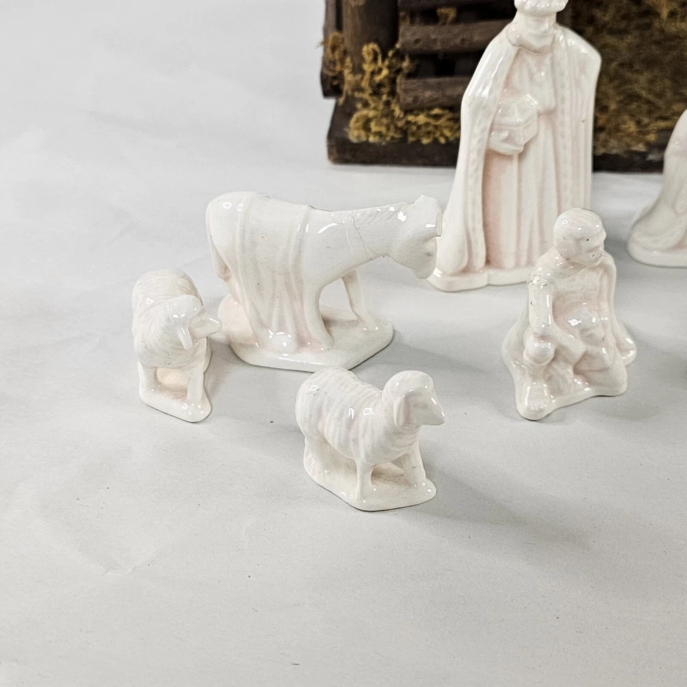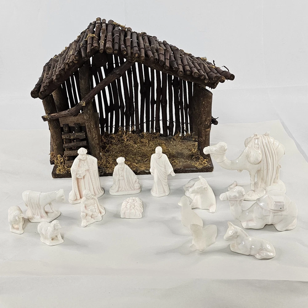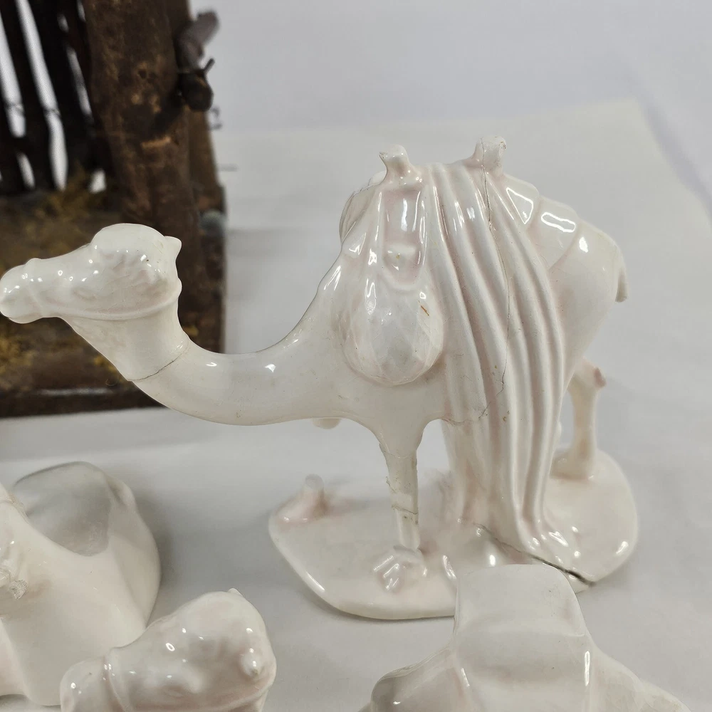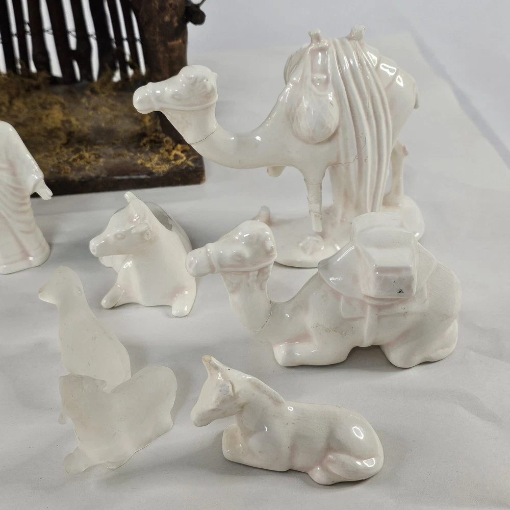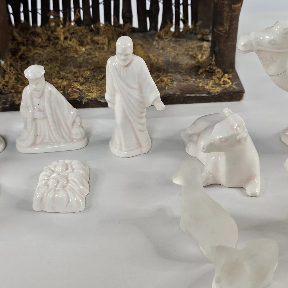 Vintage Porcelain Nativity Figurines Set Of 15 Wood Stable. Some Pieces Have Had To Be Repaired/Glued, And Missing Some Pieces. Please Check All Pictures Closely For A More Detailed Visual Description Of Ware And Condition. Ships Out Free Within One Business Day.