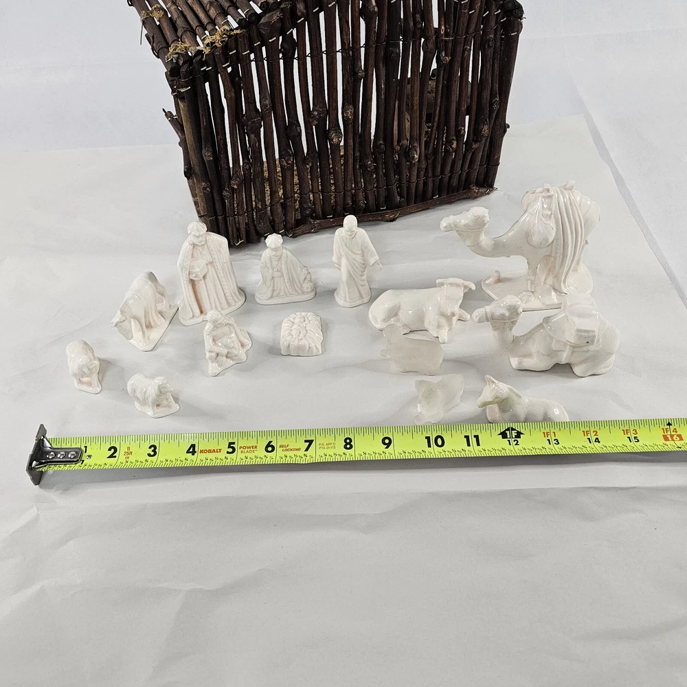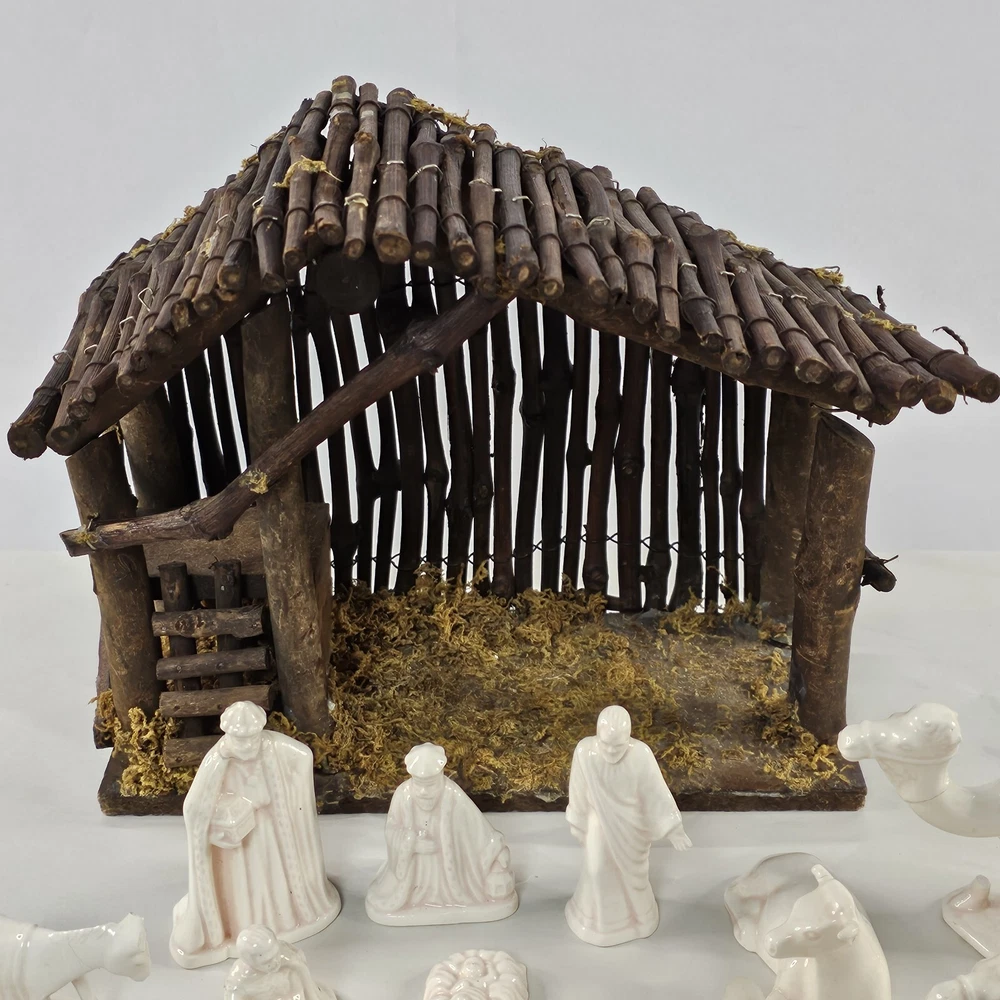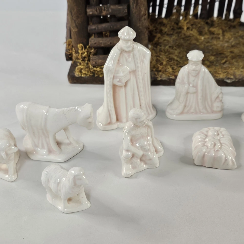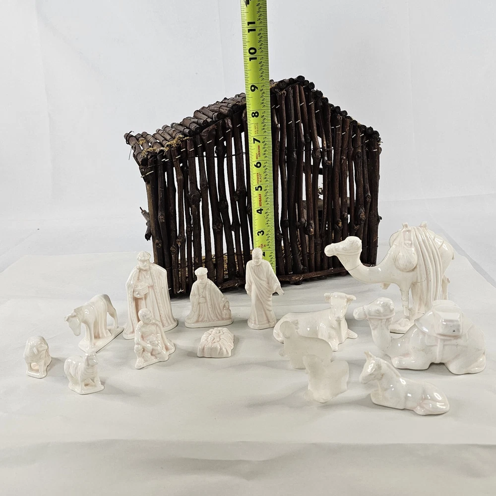 Vintage Porcelain Nativity Figurines Set Of 15 Wood Stable. Some Pieces Have Had To Be Repaired/Glued, And Missing Some Pieces. Please Check All Pictures Closely For A More Detailed Visual Description Of Ware And Condition. Ships Out Free Within One Business Day.