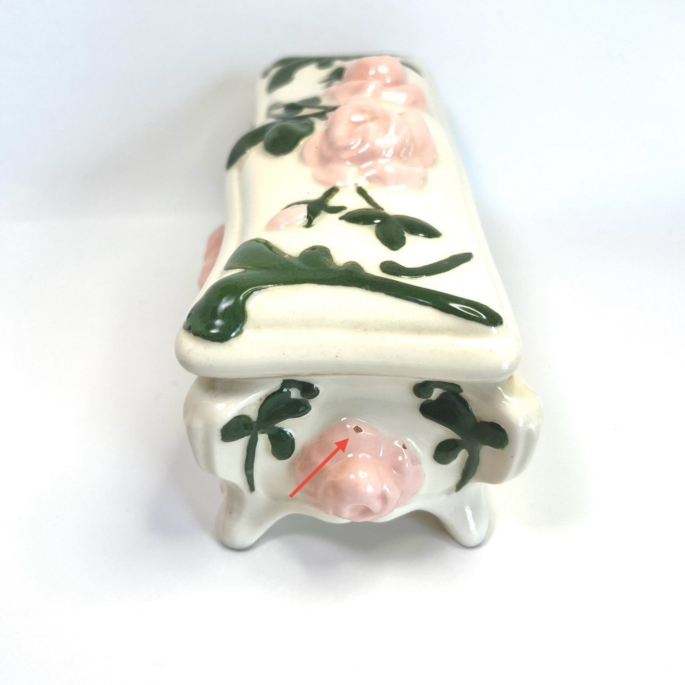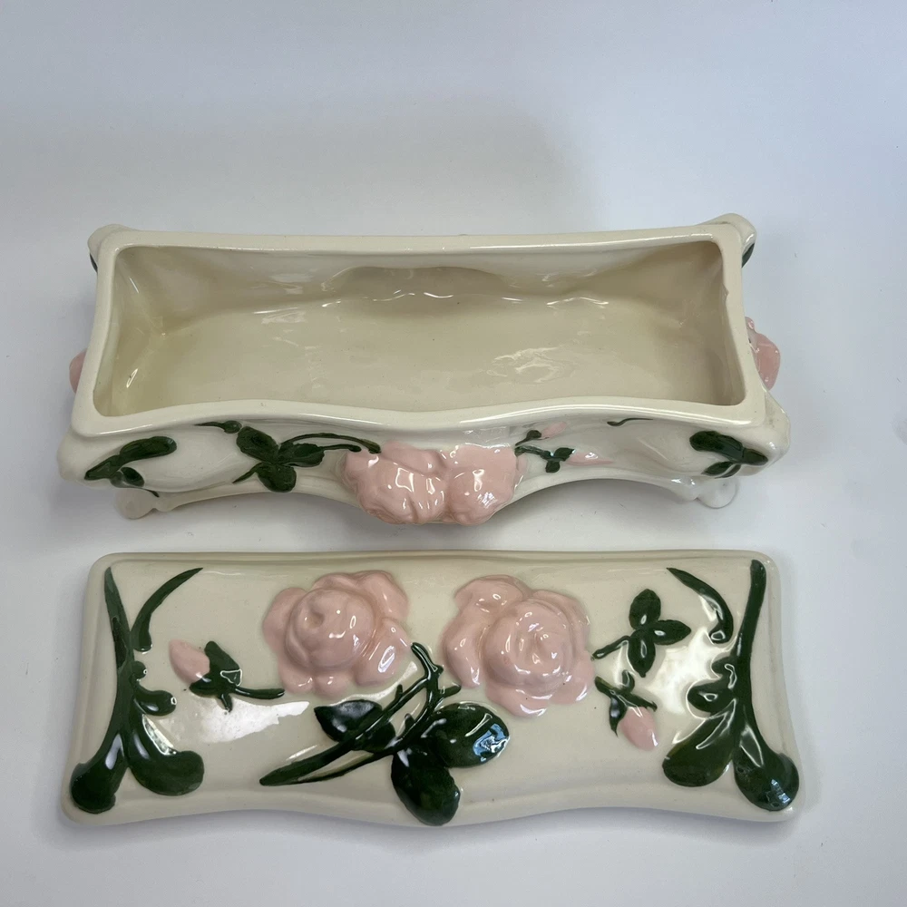 Add a touch of vintage elegance to your décor with this charming Victorian-style ceramic trinket box. This delightful piece features a classic design with delicate pink roses and green leaves, perfect for storing jewelry, small treasures, or simply displaying as a decorative accent. This trinket box boasts a footed design with four ornate legs, adding a touch of sophistication. The removable lid is adorned with sculpted pink roses and green leaves, creating a beautiful focal point. The interior provides ample space for storing your precious items. Crafted from ceramic, this box has a smooth, glossy finish that complements its Victorian-inspired aesthetic. The soft pink and green hues create a romantic and timeless appeal. Please note that this trinket box exhibits minor signs of wear, consistent with its vintage style. These signs of wear are visible in the provided photographs. Please examine the photos carefully as they are an integral part of the description and accurately represent the item's condition. This trinket box is perfect for a variety of uses, from storing jewelry and keepsakes to adding a decorative touch to your vanity, dresser, or shelf. It would also make a lovely gift for someone who appreciates vintage-inspired décor.