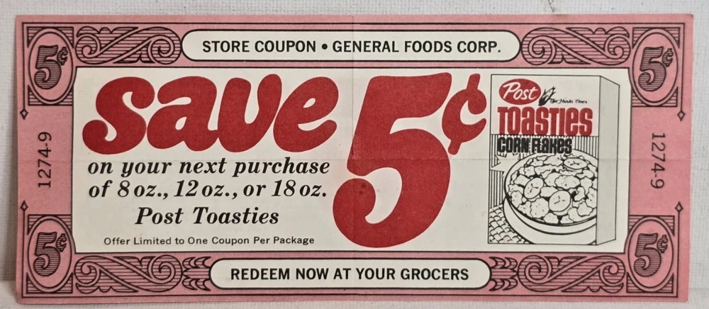 Vintage Post Toasties Coupon General Foods 5 Cents REDEEM NOW