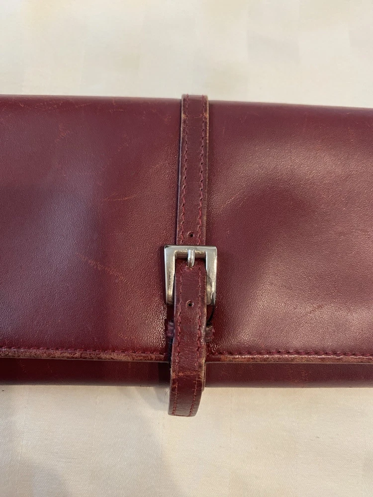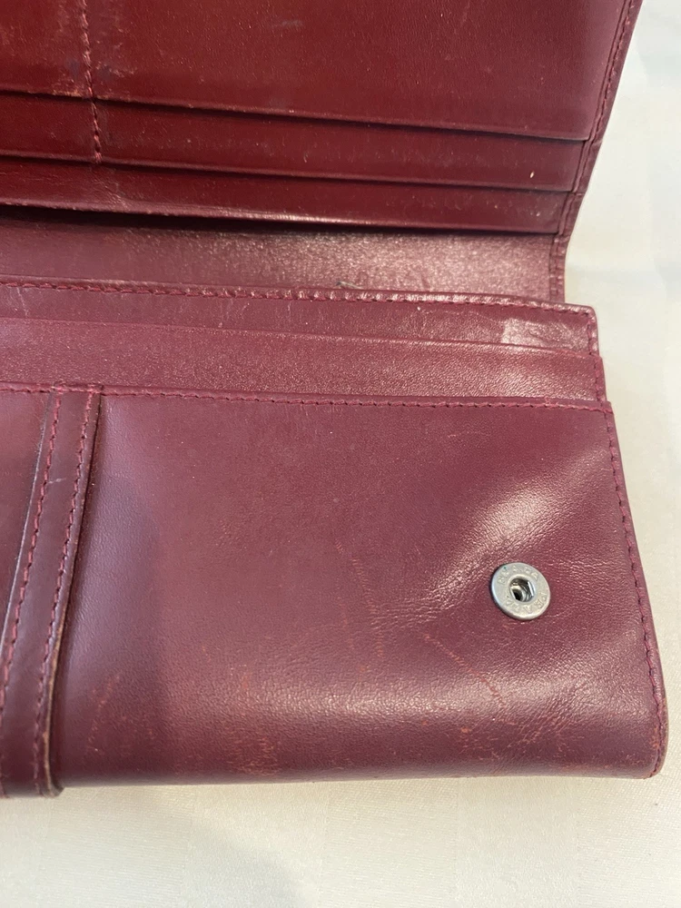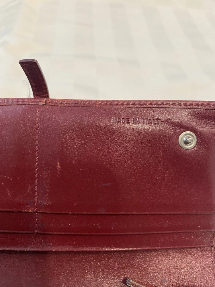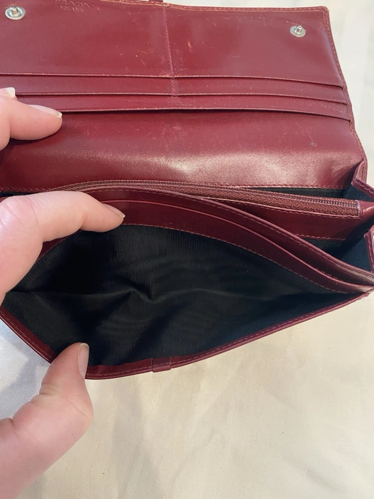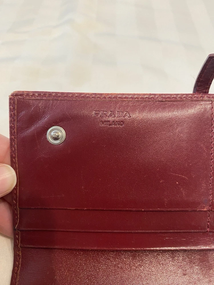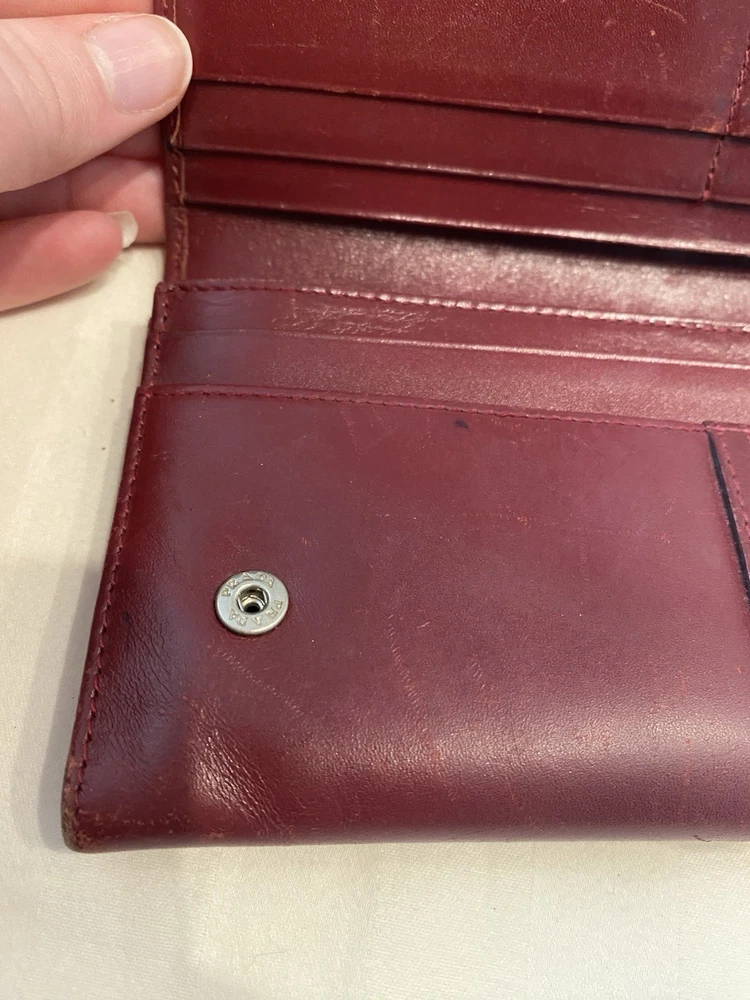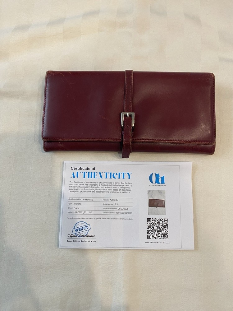 The Rare Prada Bordeaux Bifold Wallet is a luxurious vintage designer accessory for women. Made from maroon/red leather with a solid pattern, this wallet features button closures, embroidered accents, and the iconic Prada logo. Crafted in Italy, this wallet includes credit card slots, a checkbook holder, and a folding design, offering both style and functionality. With its timeless appeal and high-quality materials, this wallet is a must-have for any fashion-forward individual looking to add a touch of sophistication to their collection. Preowned- good condition (especially considering the age of this piece). See photos for pictures of wear/condition. Scratching to leather noted to outside/inside of wallet. Slight wear on the edges. Bolt Luxury sold this same wallet for $295 in similar condition. This is a one of a kind piece- no other listings of this gorgeous wallet currently on ebay! Comes with certificate of authenticity from Official Authentication. Button closure.