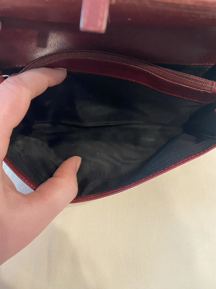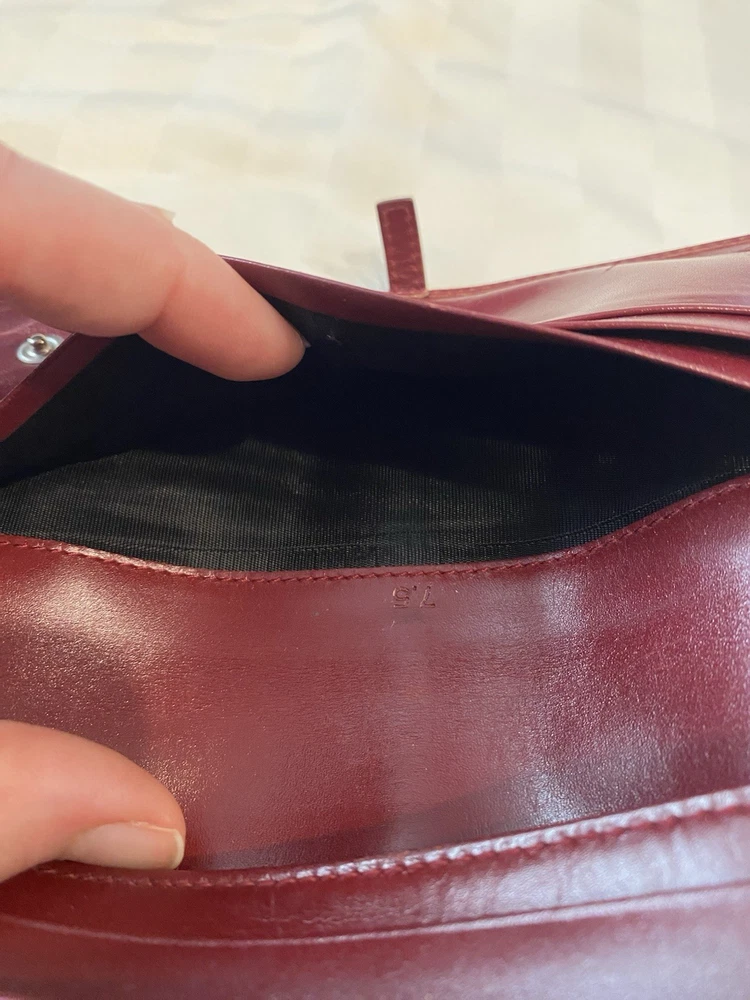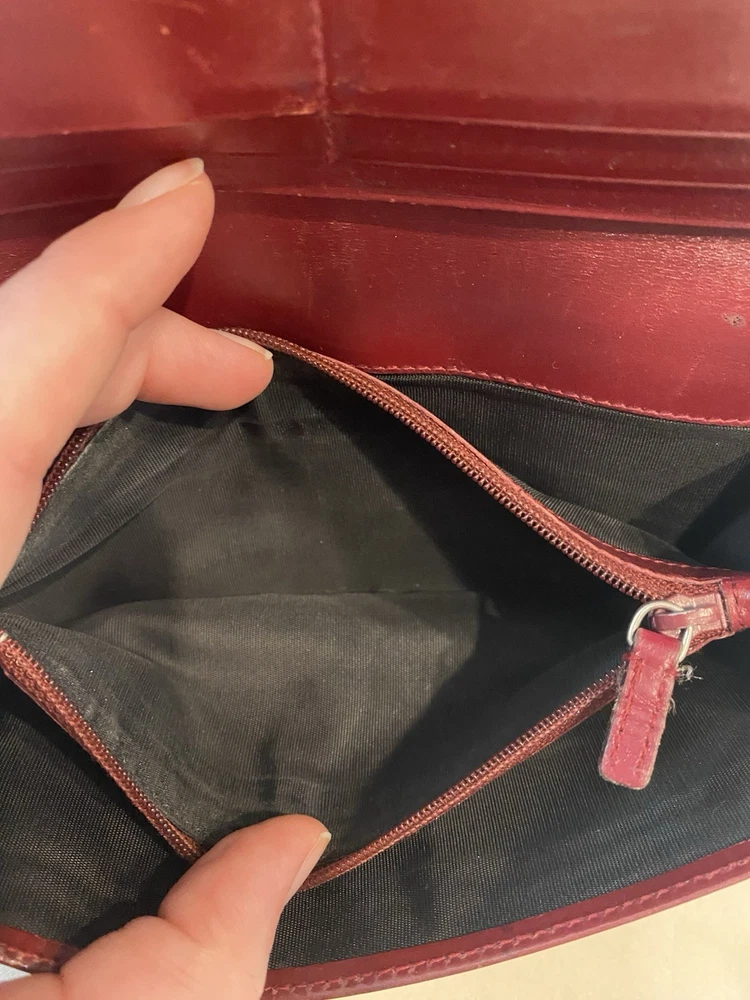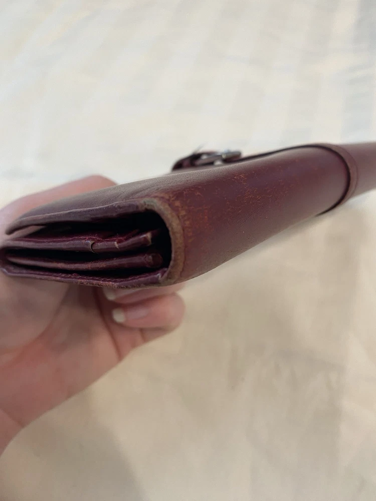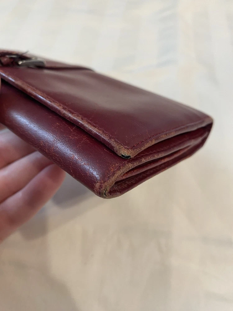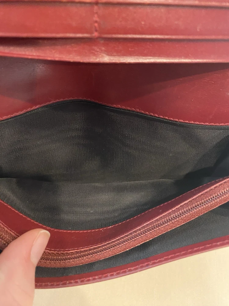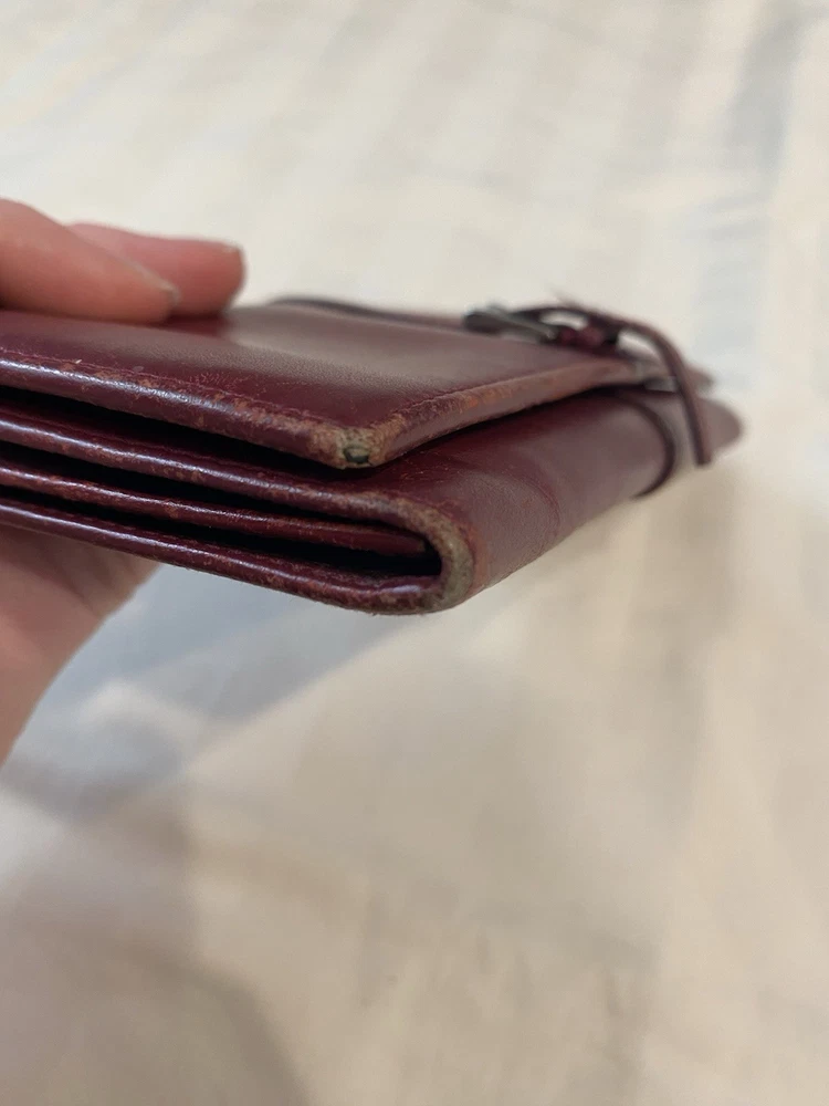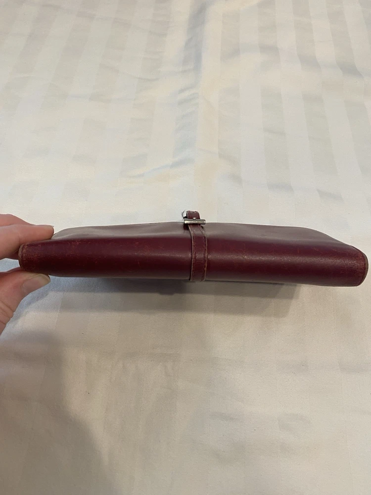 The Rare Prada Bordeaux Bifold Wallet is a luxurious vintage designer accessory for women. Made from maroon/red leather with a solid pattern, this wallet features button closures, embroidered accents, and the iconic Prada logo. Crafted in Italy, this wallet includes credit card slots, a checkbook holder, and a folding design, offering both style and functionality. With its timeless appeal and high-quality materials, this wallet is a must-have for any fashion-forward individual looking to add a touch of sophistication to their collection. Preowned- good condition (especially considering the age of this piece). See photos for pictures of wear/condition. Scratching to leather noted to outside/inside of wallet. Slight wear on the edges. Bolt Luxury sold this same wallet for $295 in similar condition. This is a one of a kind piece- no other listings of this gorgeous wallet currently on ebay! Comes with certificate of authenticity from Official Authentication. Button closure.