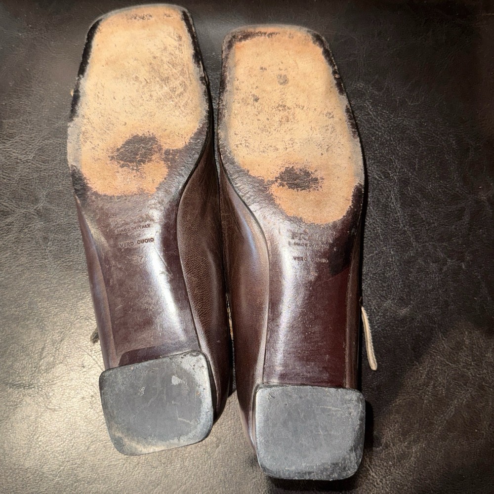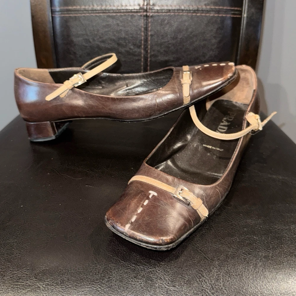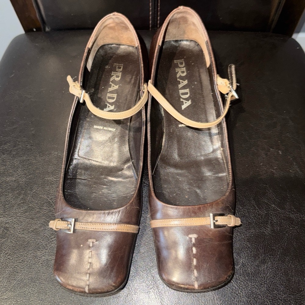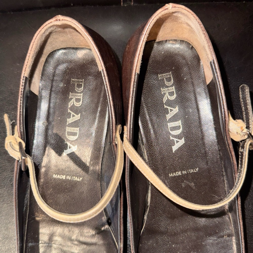 US Shoe Size: 6 Toe Shape: Square Toe Type: Heel Upper Material: Leather Department: Women Features: Straps Customized: No Color: Brown UK Shoe Size: 37 Style: Mary Jane Closure: Buckle Character: Marie Vintage: Yes Theme: 90s Heel Style: Kitten Brand: PRADA Country/Region of Manufacture: Italy