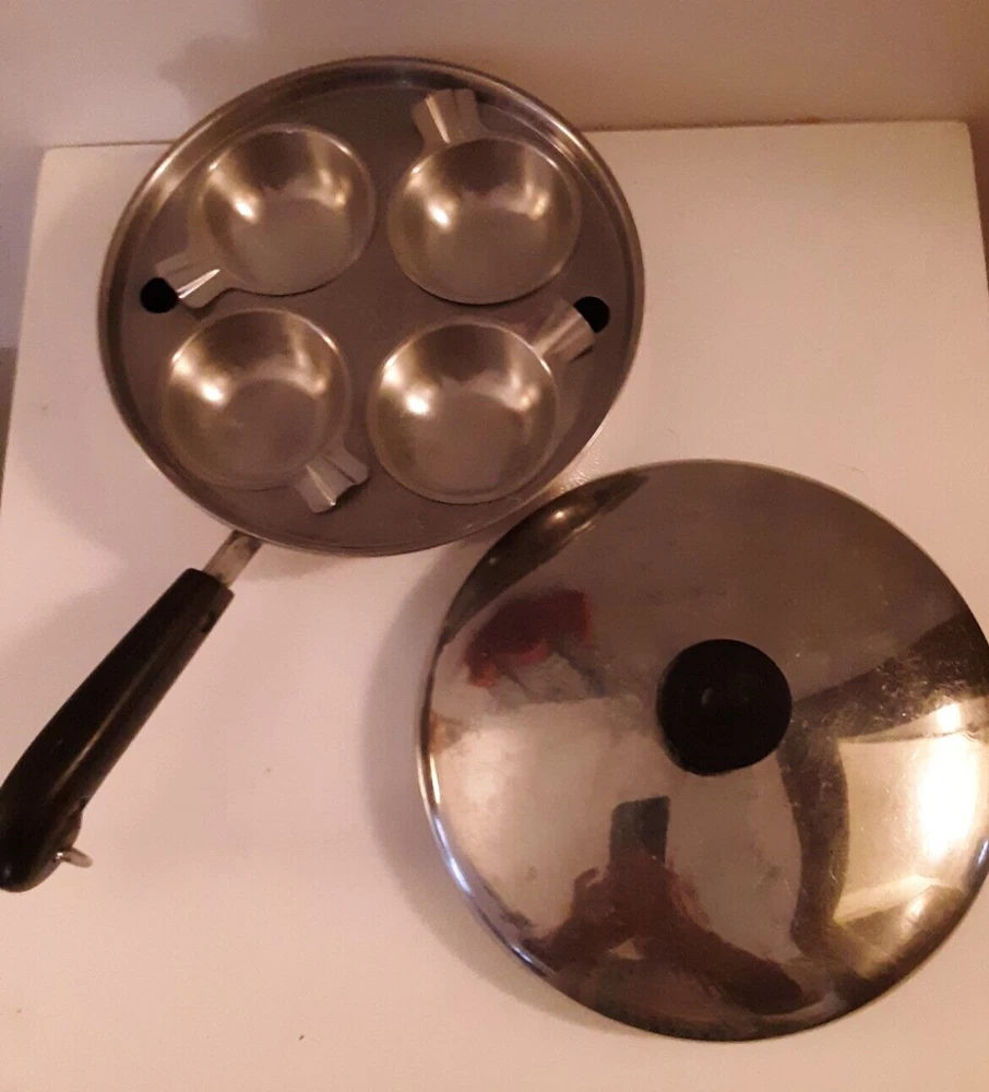 Set includes: 8" fry pan Lid Egg poaching ring insert 4 Egg poaching cups Pre 68 double ring logo on pan