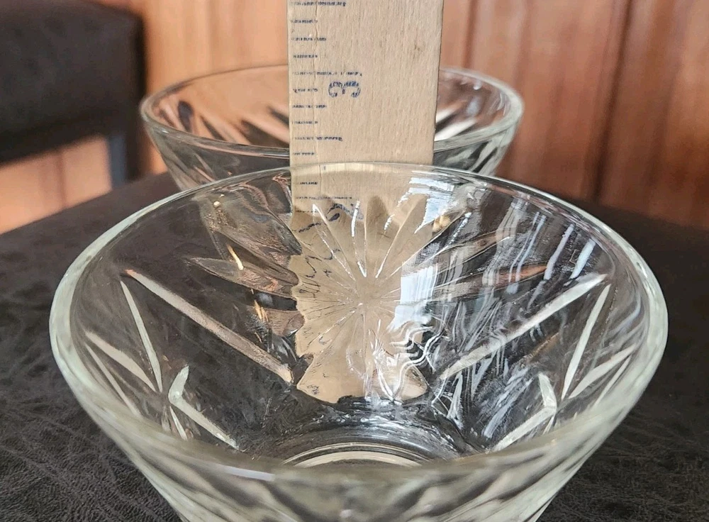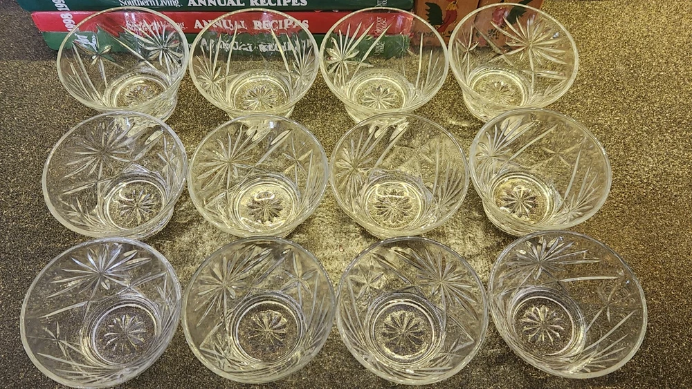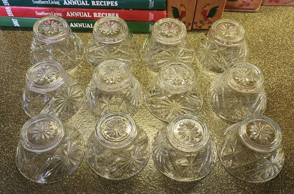 HomeVintage Prescut Oatmeal Custard Bowls Set of 12 Clear Glass Anchor Hocking Excellent Condition