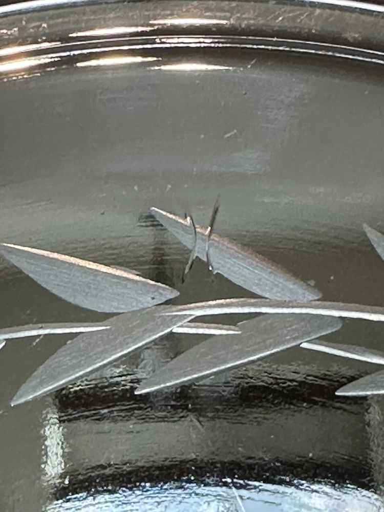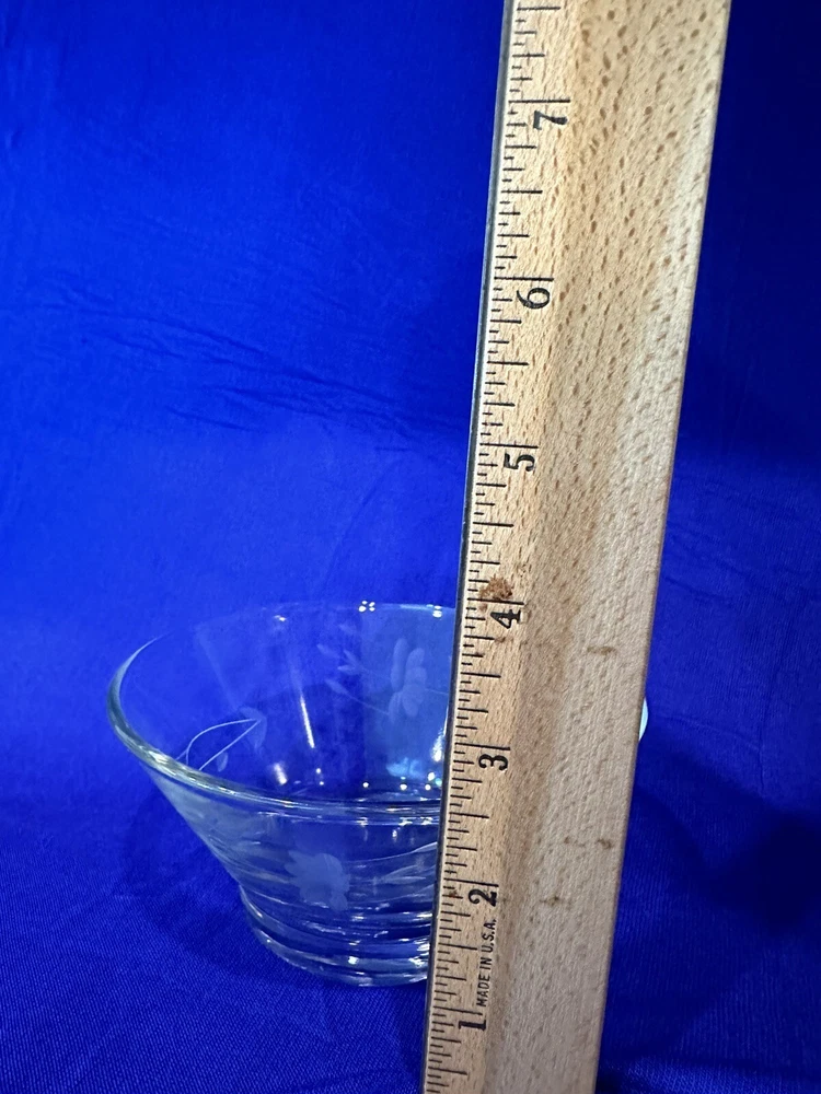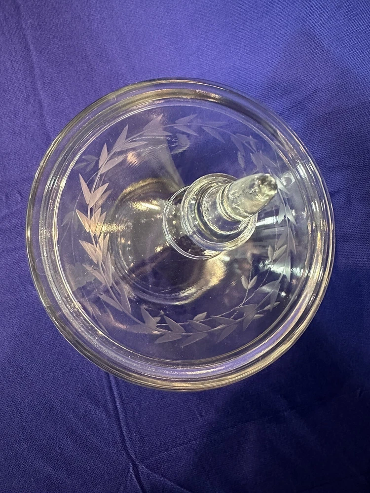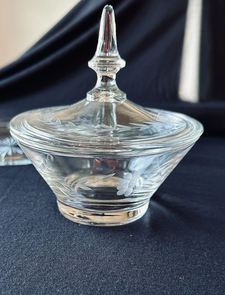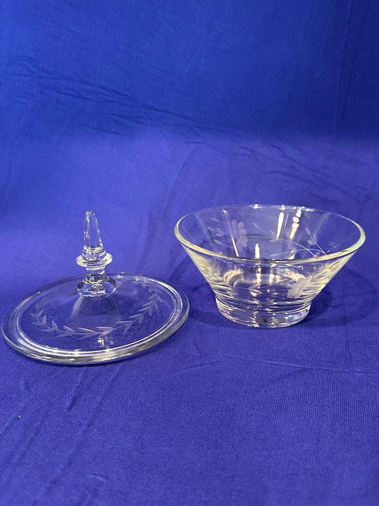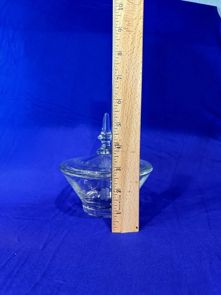 Pretty floral etched candy dish and lid. Dimensions Height - Bowl: 2 1/2 inches Bowl with lid: 6 inches Weight- 1 lb, 3 oz Diameter - 5 inches Very good condition with no discernible cracks or chips on bowl. Lid has a scratch. Etching is in excellent condition. Please refer to pictures. Sold as is.