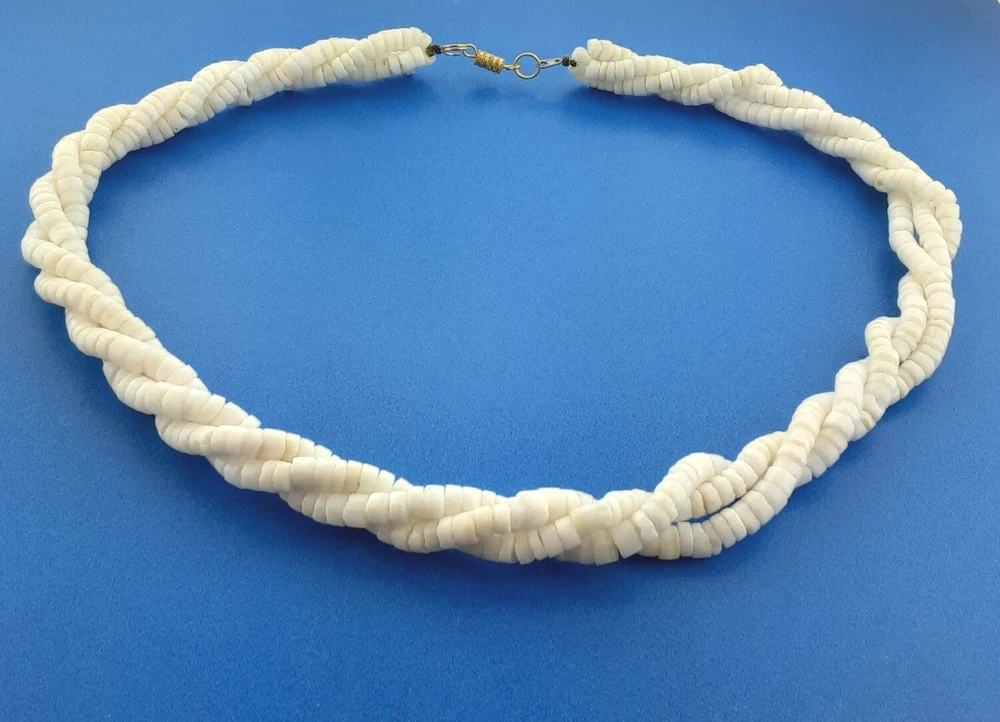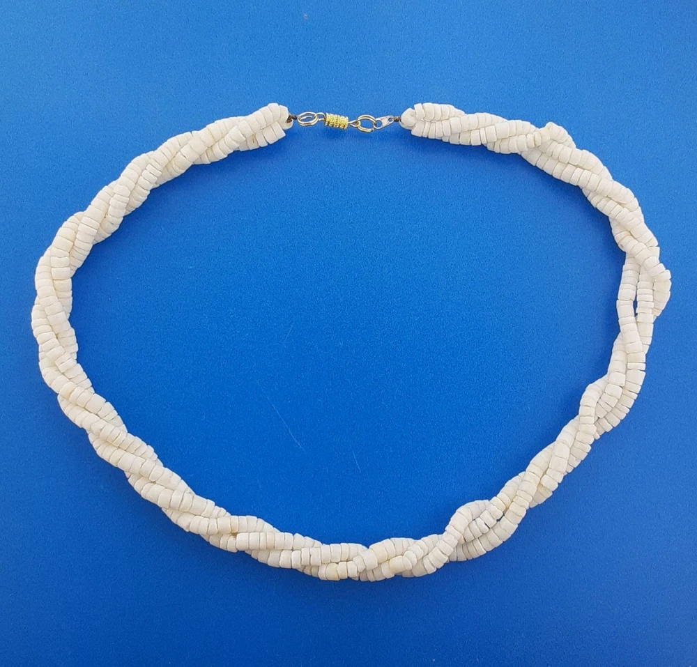 This vintage Hawaiian necklace features beautiful 5 mmm puka shells twisted in three strands to create a stunning piece. The necklace measures 10 mm wide, 18 inches wearable length, barrel clasp, very good condition. Originating from the Pacific Islands, this necklace is a unique and authentic addition to any collection.