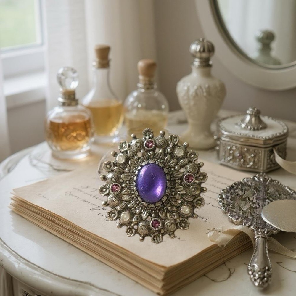 Vintage Purple Cabochon Silver Tone Brooch Pin - Retro Elegance