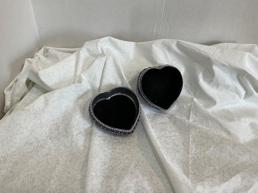 Item Width: 4” Theme: Boho Elegance MCM Material: Glass, Metal, Mixed Materials, Velvet Features: Boxed Type: Trinket Box Finish: Beaded Shape: Heart Brand: Unbranded Occasion: All Occasions Number in Pack: 1 Packaging: Box Item Height: 1.75” Color: Purple and gray Pattern: Hearts Size: Small Closure Type: Push On Lid Item Length: 3.75” Style: MCM Subject: Boxing Collection: Keepsake Boxes Seller Notes: “No issues”
