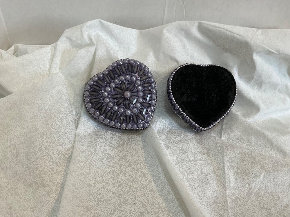 Vtg Heart Shaped Trinket Box Beaded Purple and grey. Beautiful sparkling trinket box. Pearls and crystal embellishments. * Thank you for shopping with Becky