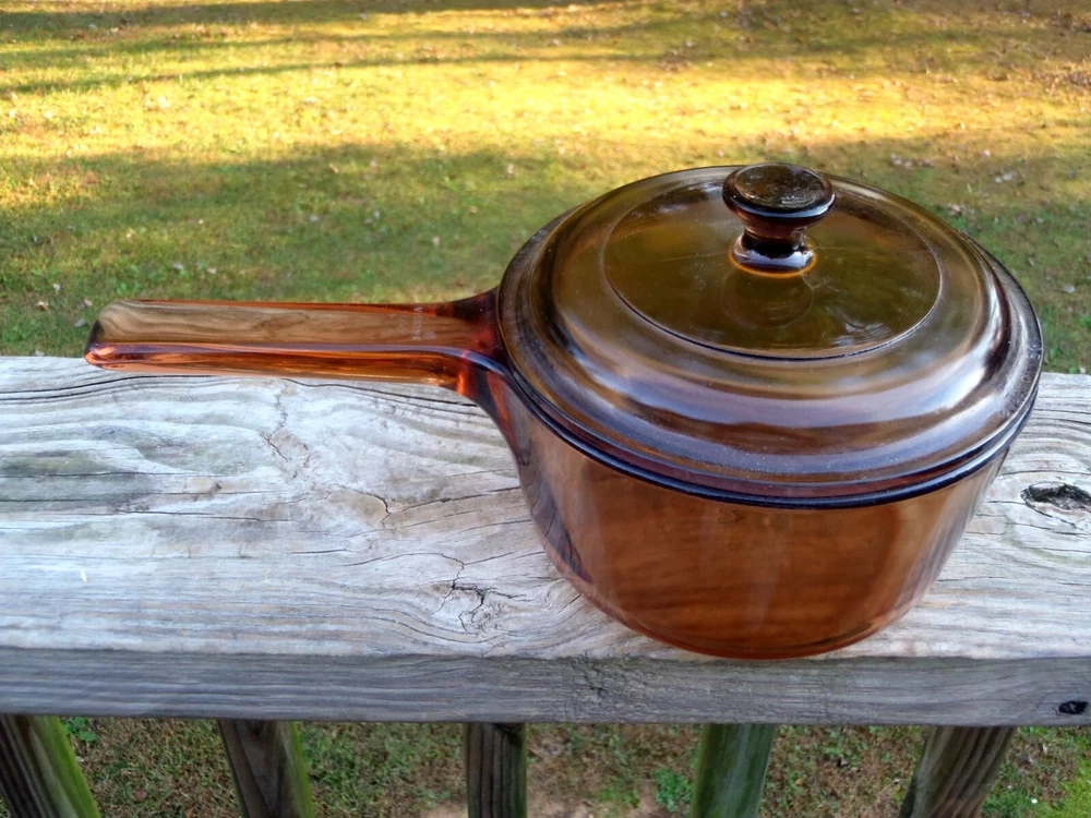 Up for auction here is a vintage Corning Pyrex Vision amber glass 1 liter sauce pan with its original lid ca. 1970's. It is in very good pre owned used condition with only some light use wear but No chips, cracks, or repair. Please see pics as they are part of the description. This sauce pan measures approx. 4 3/4" with the lid, 3" without by 6" wide across the top and 10 5/8" long from handle to outer edge. It is marked on the handle *VISIONS FRANCE V-1-B*, and "PYREX P 8 1 C" on the outer edge of the lid. Folks, this is a great vintage Visions amber glass 1 Liter sauce pan with lid and it would go great in a collection or home. USPS Priority/Parcel and FedEx Ground/Home Delivery mail true calculated shipping costs is based on a insured well wrapped and packed 4 pound shipment, box size 12x8x6. Please see the available shipping services with calculated shipping costs under the Shipping & Payments tab above the Item Specifics on our auction page or scroll down to the Shipping, returns & payments section and hit the small arrow on the right of Returns, thanks. NO WORRIES ... YOU CAN BID HERE WITH CONFIDENCE! We are a true U.S. seller, NOT a drop shipper and item ships from our U.S. location! As always ... Low Opening Bid and Never a Reserve! Plus, we NEVER end an auction early or CANCEL a bid after the auction has ended! PLEASE BID ONLY IF YOU ARE SERIOUS and INTEND TO PAY IF YOU ARE THE SUCCESSFUL WINNER! Our quality merchandise come directly from Estate Sales, private homes, thrift shops, and local auctions hand picked and purchased by my husband and me. As most of you may know, most vintage or used items will have some age and/or wear, and here we like to describe as accurate as possible and show many photos, so you know exactly what you are bidding on. So please read our detailed description and look at the pics as they are part of the description and ask any questions prior to a bid. Lord knows we are all only human and do make mistakes, but we honestly try very hard not to here so please rest assure and bid with confidence. Typically, our photos are shot outdoors under natural lighting on a not so fancy old railroad tie, rail, against our home, or somewhere outdoors, so please excuse any camera reflection glares, white spots or specks and shadows. Yes, we are old school and our descriptions also may be more lengthy than others, but we like you know exactly what you are buying/bidding on so there are no surprises. Please read the entire description, see all photos and ask any questions before placing a bid. All emails/messages are answered. We are rural and ship by USPS Priority/Parcel and FedEx Ground/Home Delivery (true calculated shipping) and (free shipping) for local pick-up. We also recycle and use over-sized boxes and new high quality packaging materials to ensure your item(s) will arrive to you safe and unharmed. We do not charge for boxes, packaging materials, gas, or handling. We do not profit any money from shipping costs. You are only charged true actual calculated postage and all items are shipped fully insured with carrier. We ship same or next day unless it is a holiday or a weekend, then shipment will be the following business work day. We ship to buyers in the United States, we do Not ship Internationally. Payment is due within 3 days of close of auction, unless you have made prior arrangements with us. A non paying bidder notice will be issued after four days and a strike goes against your account. Please bid only if you are serious and intend to pay within the allotted time frame. North Carolina buyer must pay 7% sales tax. We combine shipping to save you money and give shipping discounts on 3 or more auction wins. The eBay combined shipping calculator is not always correct, so if you win 2 or more auctions please request or wait for a combined invoice for appropriate total. Our items come from a smoke free home. We do have dogs, but all items are stored in a pet free environment until delivery day. Claims/Refunds - Please DO NOT request a return on merchandise damaged in shipping. Insurance claims can only be filed upon proof of damage (proof of damage is pictures which are most needed to file claims) and before issuing you a refund. So if your item happens to arrive to you damaged in shipping, please contact us and DO NOT THROW ANYTHING AWAY. In order to file a USPS/FedEx online claim, we must have pictures of the shipping box at every angle, shipping labels (tracking/addressee), bubble wrap, wrapping/packing materials (packing/partitions), and of course the breakage. Once we receive all the requested pictures, we can send you a full refund ASAP. We usually don't have problems, but you just never know with shipping carriers these days with all their automated robotic sorters and all. If there is a problem with your order, simply contact us. As an old-school eBay Seller, we list in the spirit in which eBay was founded; a place to find vintage, unusual, rare, hard-to-find, one-of-a-kind, and various quality items at affordable prices! SHOP, BID and BUY WITH CONFIDENCE! SATISFACTION GUARANTEED! Please, no buyer's remorse and ask any questions before placing a bid. We have been auctioning on eBay for 23+ years and truly only want the very best for you and us both. We honestly describe all our items to the best of our knowledge and ability and show many photos, but if you have a question(s) or just need further info. or pictures, please let us know. We don't just want you satisfied; we want you to be a happy returning customer for years to come! ;) THIS IS A 10 DAY AUCTION and HIGHEST BID WINS! GOOD LUCK IF YOU SHOULD BID! THANKS and GOD BLESS!