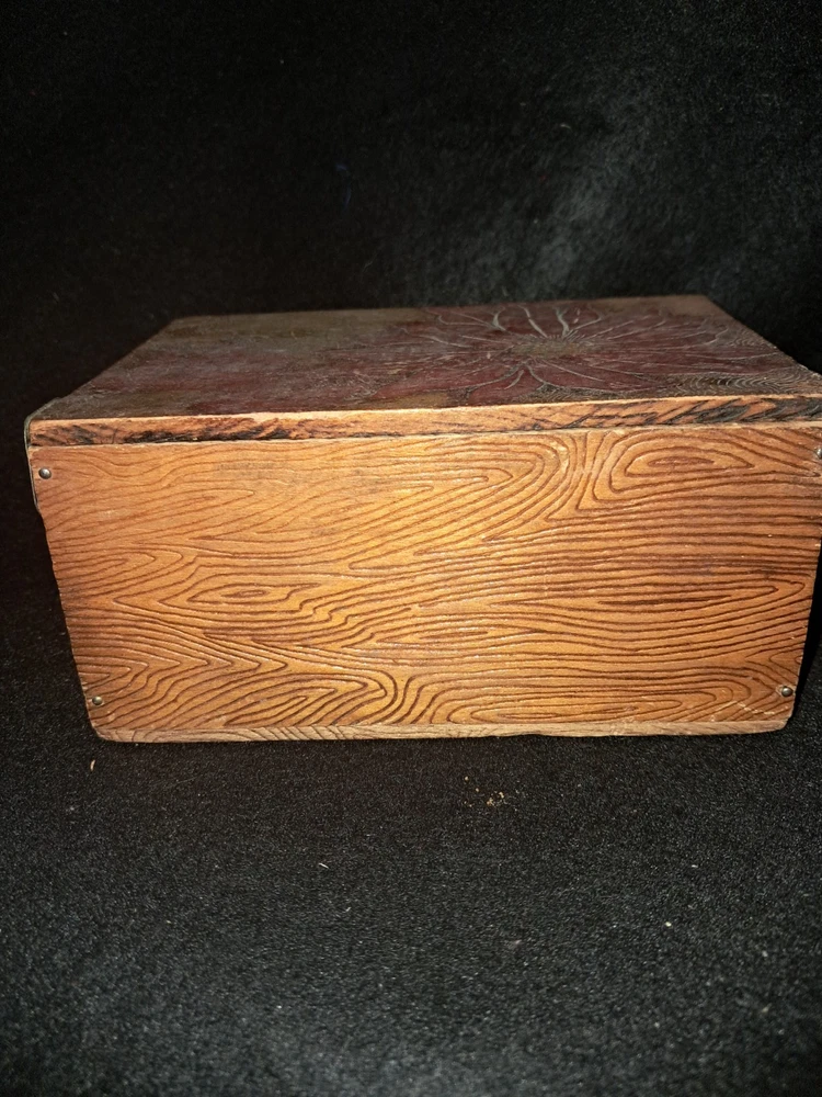 This vintage pyrography box is a beautiful addition to any collection. The rectangular shape and floral pattern make it a perfect keepsake box for any occasion. Measuring 5.75" x 4" x 3", it is medium in size and can fit in any room. The box is made of wood with a painted finish and features art nouveau style. It is perfect for teens, adults, and girls who love all occasions. The box is unboxed and has been engraved with a beautiful floral design. This original piece is a must-have for collectors and those who appreciate art.