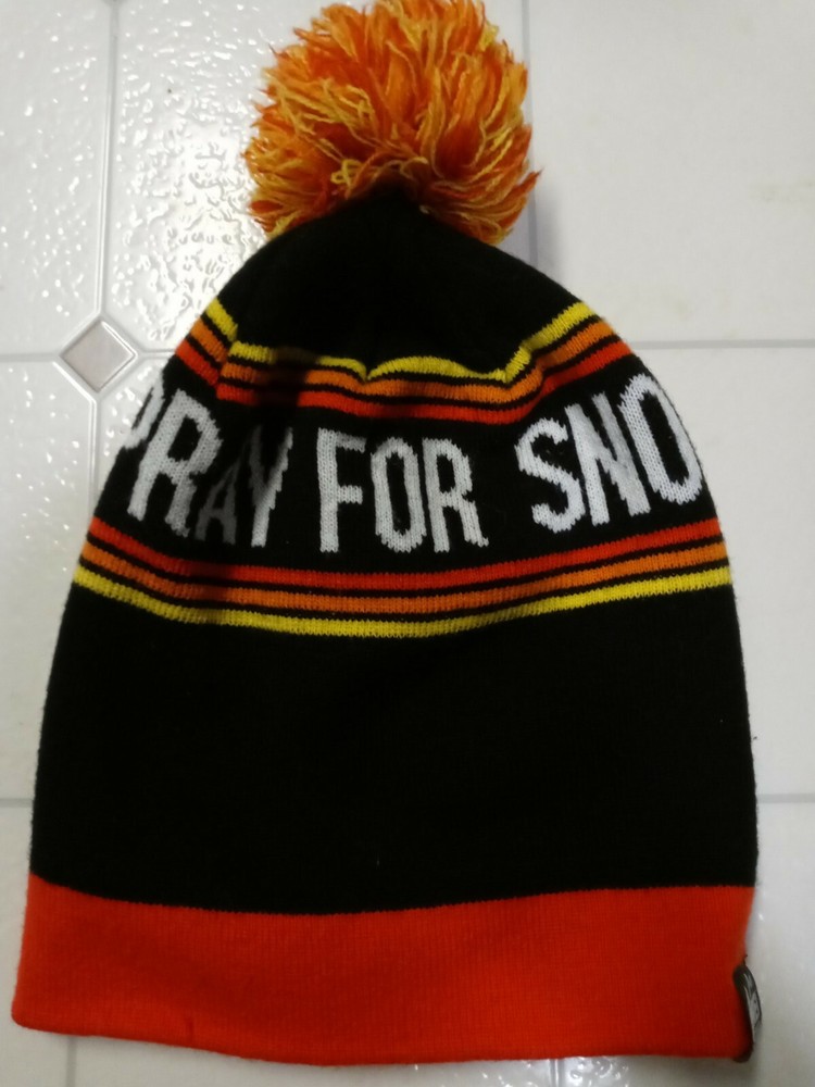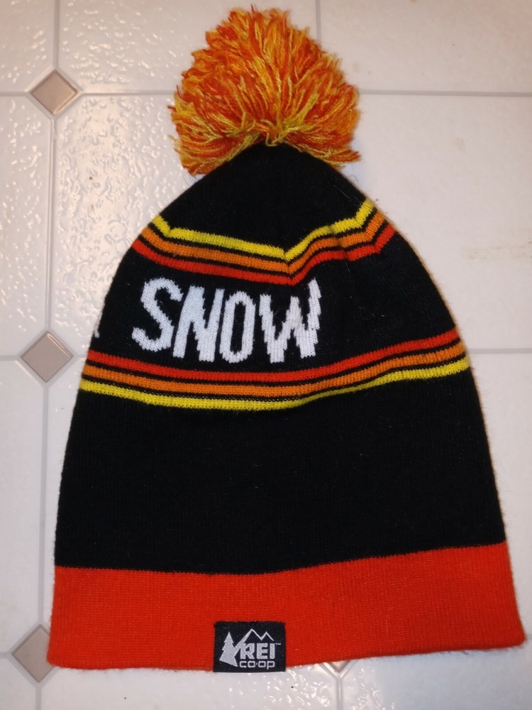 REI Retro Snow Beanie Hat Unisex. In perfect condiction. Reads "pray for snow". REI emblem tag is seen when beanie is at full length and when the bottom is flipped up as well. Fun snow ball on top. Great for men and women.