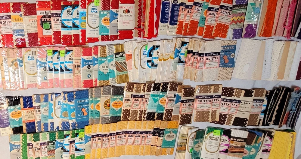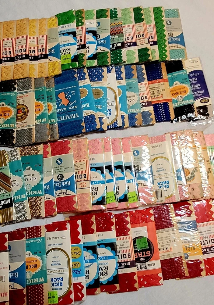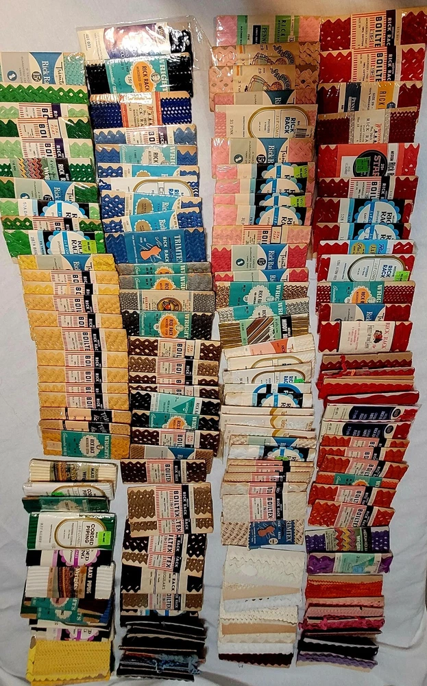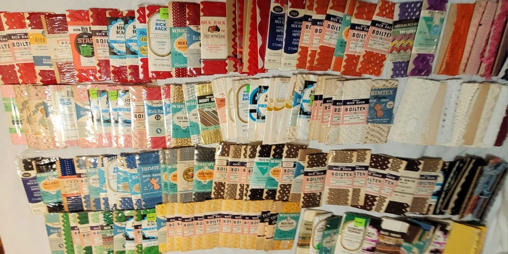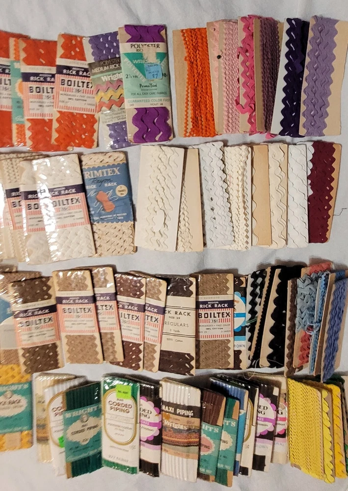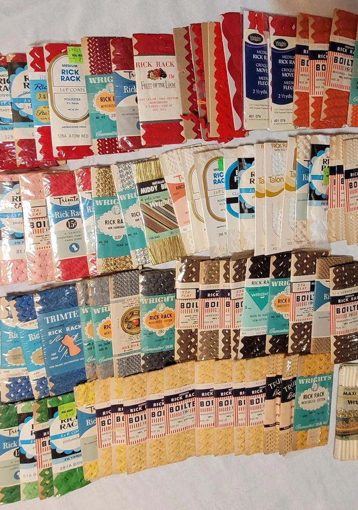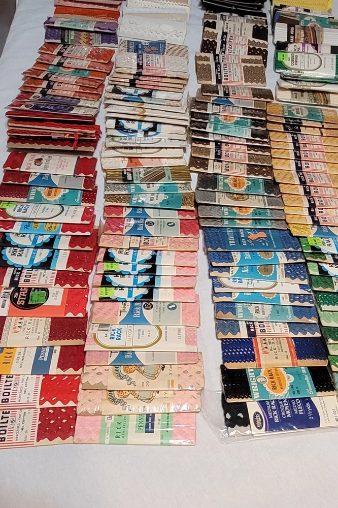 This vintage Rick Rack lot is a must-have for any crafting enthusiast! The lot includes 150+ pieces of corded pipe, metallic, and other materials that are perfect for adding a touch of elegance to any sewing project. The pieces come in a variety of colors and materials, making them versatile for use in multiple crafts. Whether you're looking to add some trim to your latest fashion design or searching for the perfect embellishment for your next home decor project, this lot has got you covered. Each piece is unique and can be used to create stunning designs that will catch the eye of anyone who sees them. Don't miss out on the chance to own this incredible vintage Rick Rack lot! Some are EXTREMELY old and may have color fading/ a little dust. Most are in packaging. Please see the pictures. These are extremely heavy, so they will have to be sent in a flat rate box. Thank You for looking!