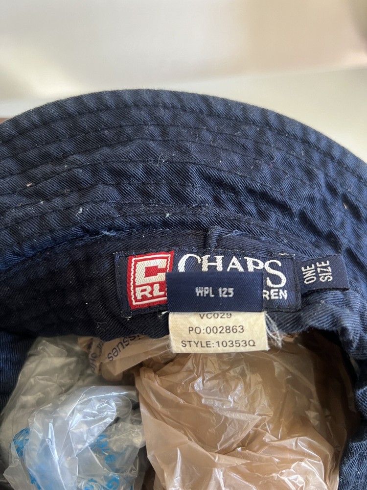 This Ralph Lauren CHAPS bucket hat is the perfect addition to any casual outfit. The navy blue color and solid pattern make it a versatile piece for any occasion. Made of lightweight and breathable cotton fabric, it features vent holes for comfort and a pocket for added convenience. The unisex design and American street theme make it a stylish choice for any fashion-forward individual. Whether you're going out for a hike or just running errands, this hat is sure to be a go-to. It's not signed or personalized, but it's a classic piece from the Chaps product line. Get yours today!