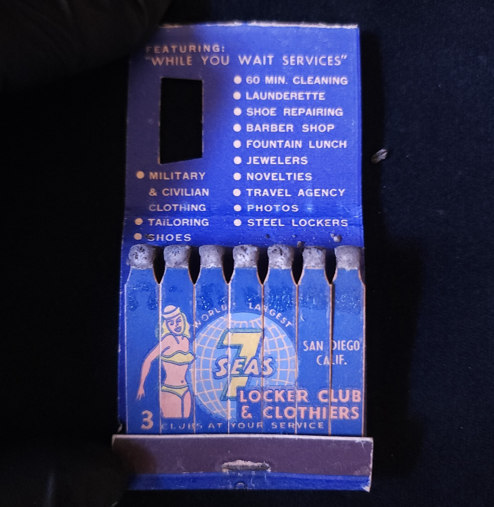 Vintage Rare 7 Seas Locker Club Girlie Feature Matchbook - San Diego, CA - Full & Unstruck Add a unique piece of nostalgic ephemera to your collection with this Rare Vintage 7 Seas Locker Club Feature Matchbook from San Diego, California! This full, unstruck matchbook, produced by Lion Match, showcases a playful Girlie Keyhole Design that captures the quirky charm of mid-20th-century advertising. With its Navy, Military, and Civilian theme, this matchbook is a vibrant snapshot of the iconic 7 Seas Locker Club, a historic San Diego hotspot known for its lively atmosphere. Condition: This quality piece is in excellent vintage condition, featuring a full set of 21 clean matchsticks and an intact striker. The vibrant colors and bold design remain crisp, making it a standout addition for collectors of matchbooks, vintage advertising, or San Diego memorabilia. Please review all photos and zoom in to appreciate the condition and details of this collectible gem. Details: Origin: 7 Seas Locker Club, San Diego, CA Manufacturer: Lion Match Condition: Full, unstruck matchbook with 21 matches Design: Unique Girlie Keyhole graphic with Navy and Civilian theme Era: Vintage, mid-20th century Sold As-Is: Matches included; see photos for exact condition This matchbook is a rare find, perfect for collectors of retro advertising, military history, or quirky Americana. Don’t miss your chance to own a piece of San Diego’s vibrant past! Have questions? Feel free to ask! Track Page Views With Auctiva's Counter
