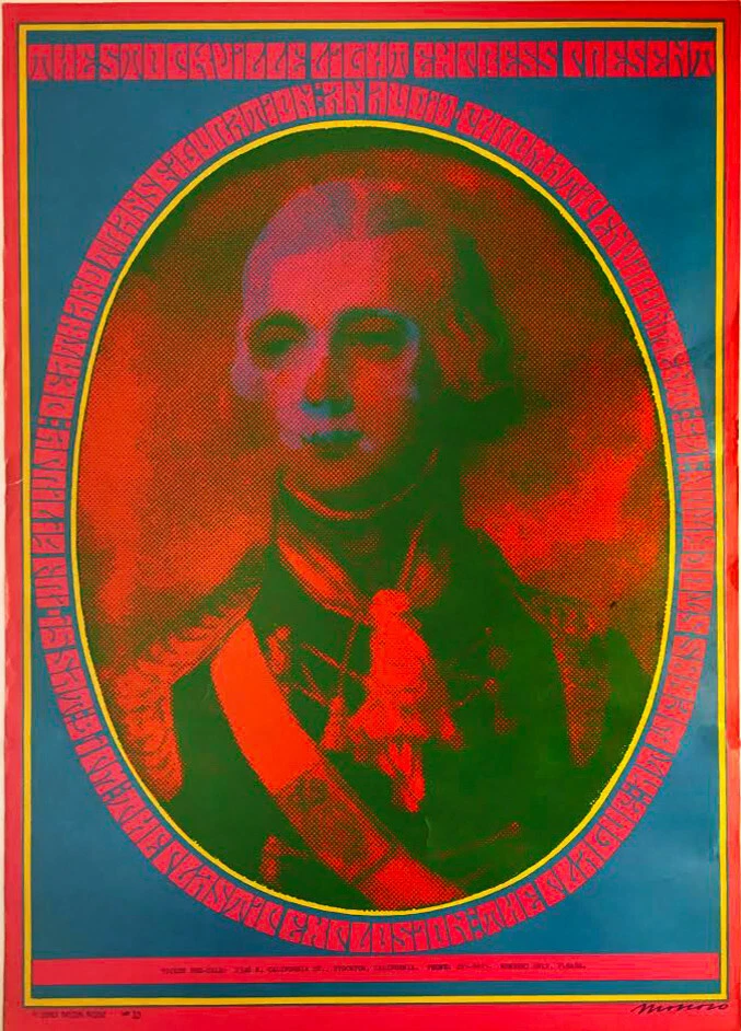 Spectacular artwork by underground artist, Victor Moscoso (Zap Comics). Under black light, a skull appears over the face! This poster is the original printing (not a reprint), and is the epitome of 60s poster art. Here's what it says: "The Stockville Express Present: Death and Transfiguration, an Audio Chromatic Environmen,t April14 Fri, April 15 Sat, 9-1pm, The Plastic Explosion, The Plague, at Webb's Stockton, I75" At the bottom it says: "Ticket pre-sale: 2346 N. California St., Stockton California Phone: 465-8833. Members Only ©1967 Neon Rose #13 Moscoso (printed signature)" Obviously this was hippest place to be. Those 2 wild nights in 1967 in Stockton! There is some wear along the edges and slight creasing, but overall this poster is in good condition. Since it was printed to advertise 2 nights in April, 1967, in Stockton CA, you can bet there's not a lot of these posters. This one of them.