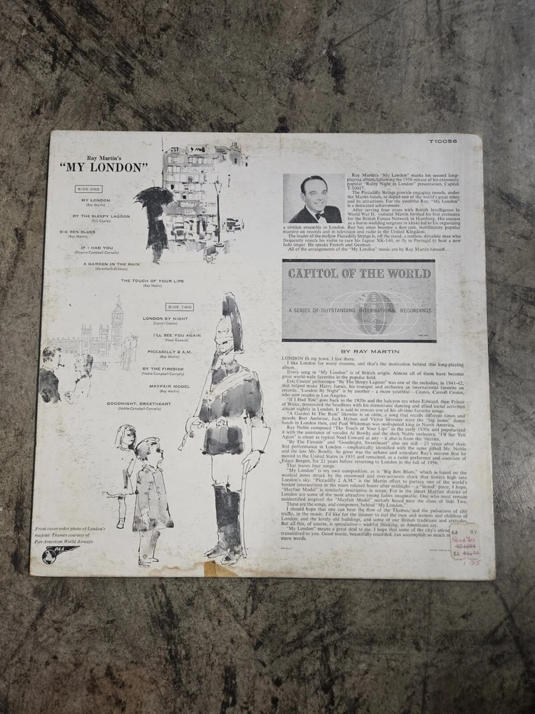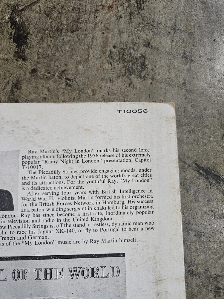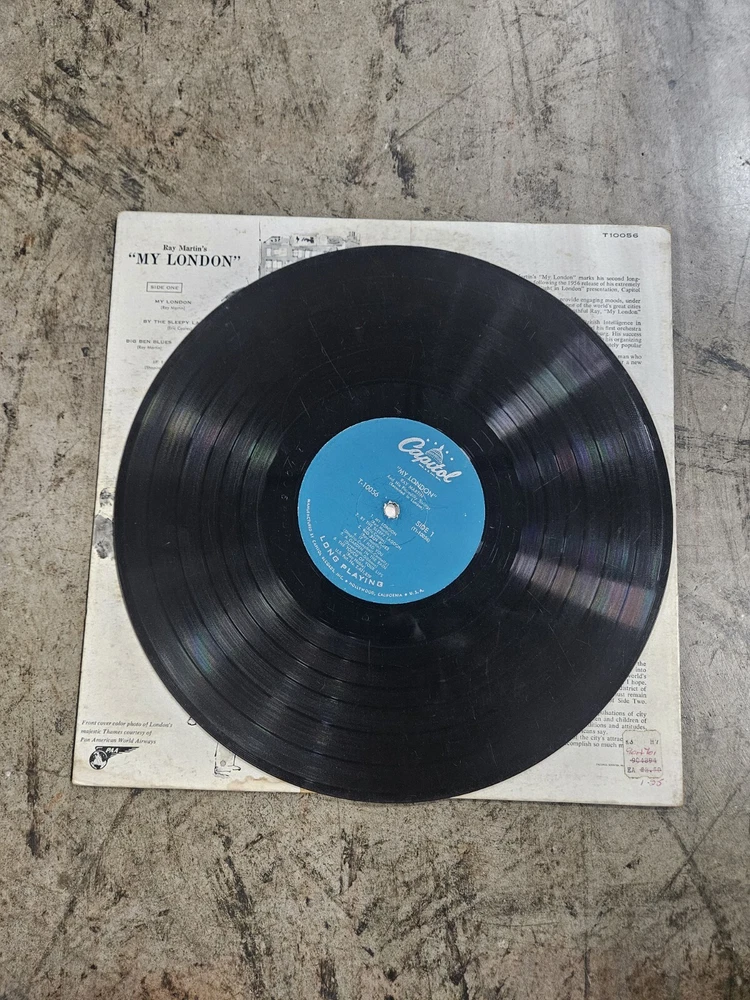 This vintage Ray Martin LP, titled "The Romantic Music of My London," is a must-have for any music collector. Recorded in 1957 on the London label, this 33 RPM vinyl features the best of musicals. The 12" record size and classic LP format make it a timeless addition to any vinyl collection. The record label, Capitol T10056, adds to its value and authenticity. This item is perfect for those who appreciate the art of music and the historical significance of vinyl records.