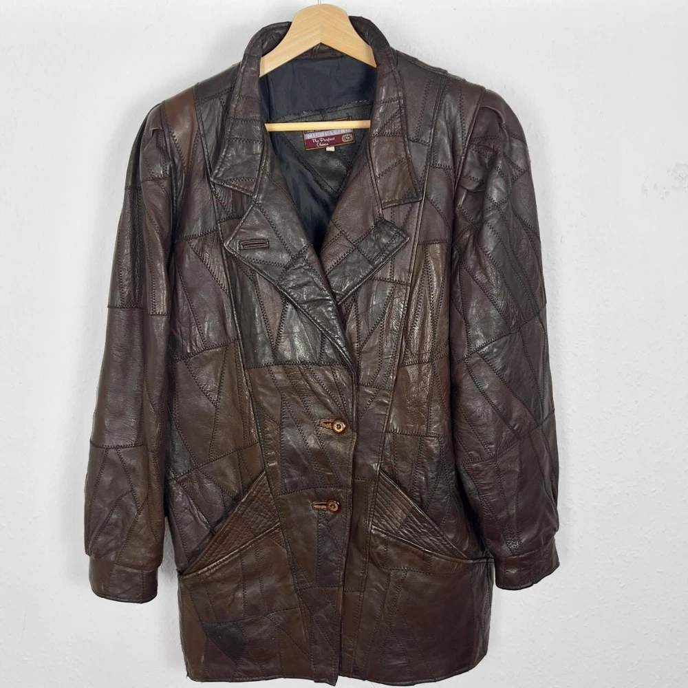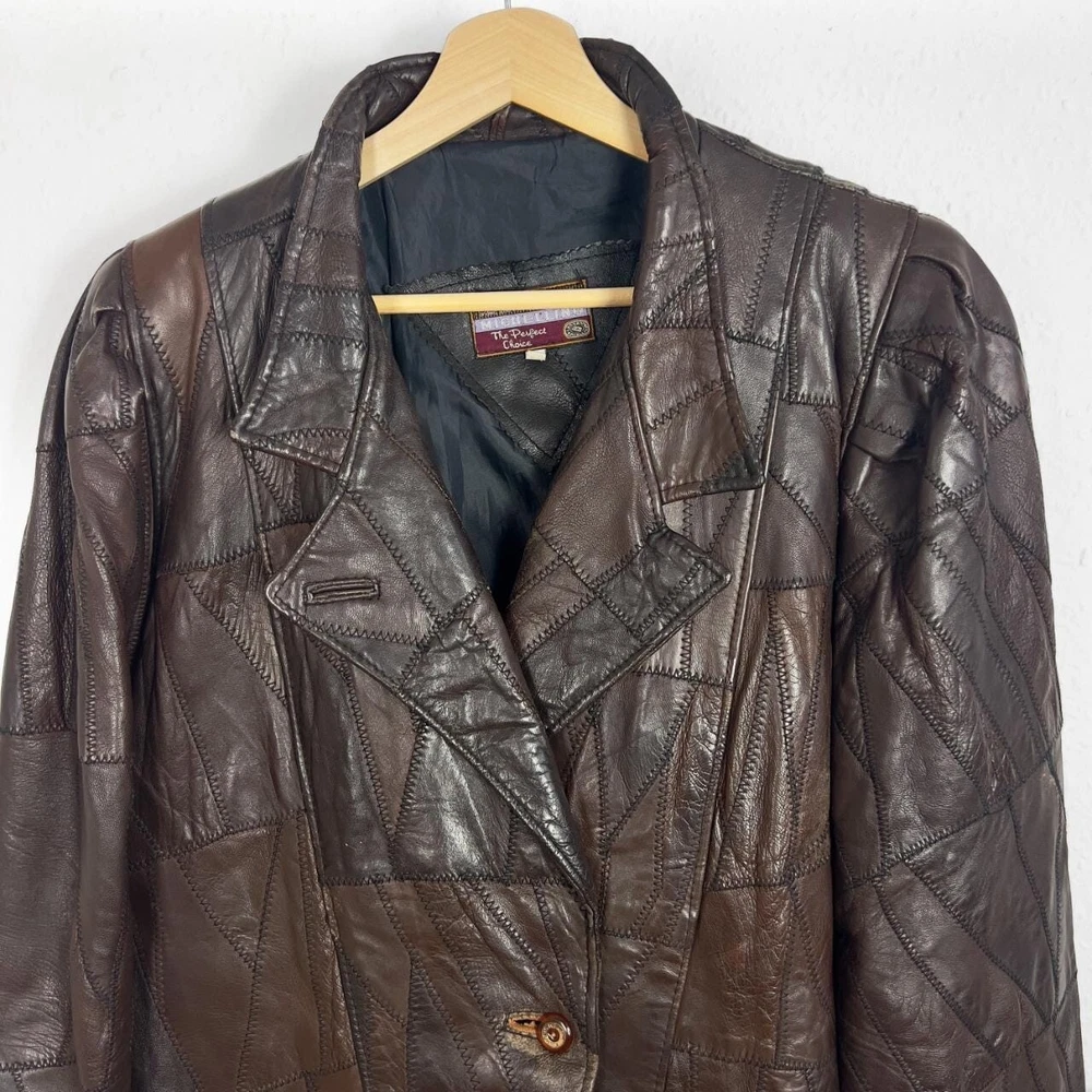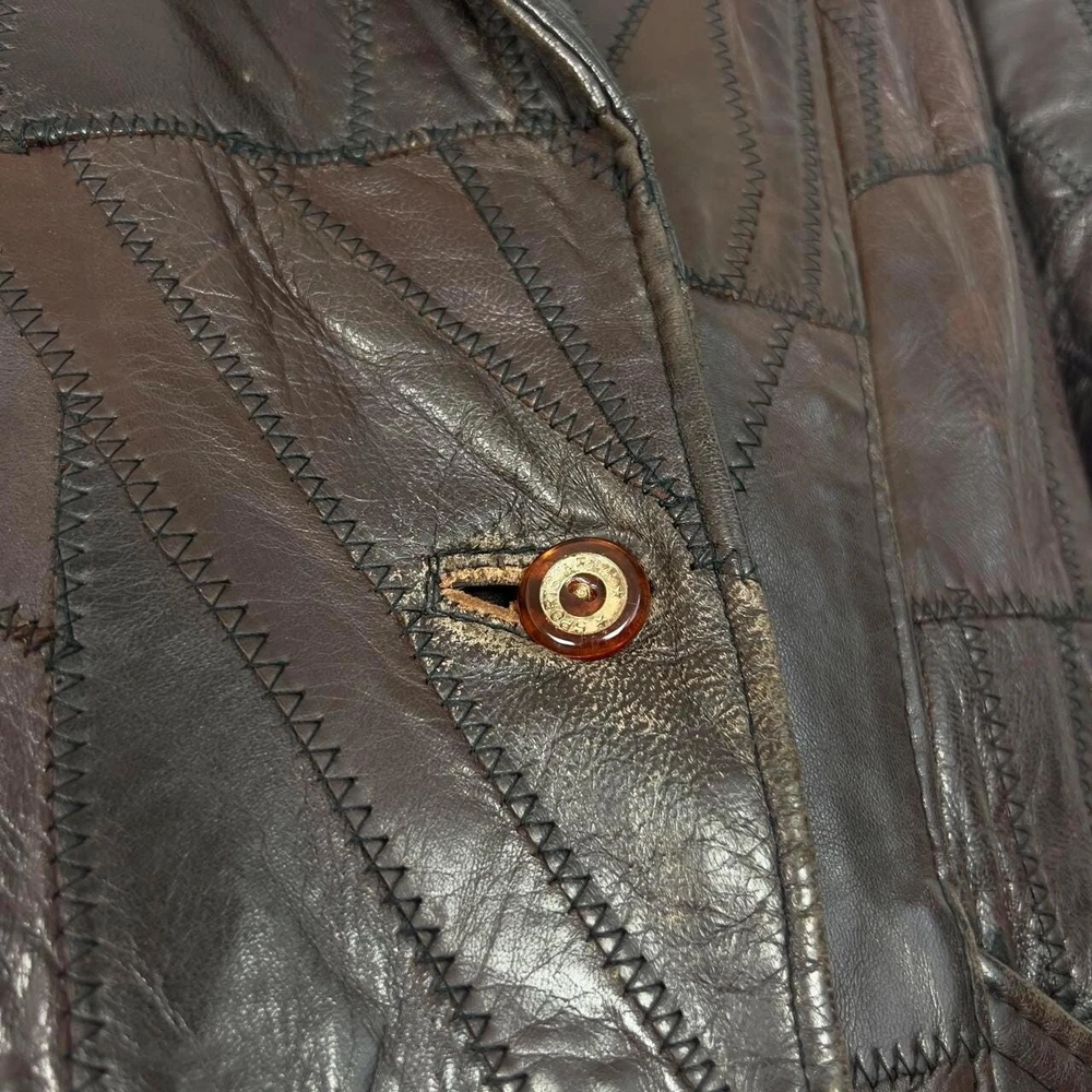 Vintage leather jacket in dark brown with funky patchwork design. Made from genuine leather, has slightly asymmetrical button up front & twin hip pockets plus lining. Some minor wear and fading to leather throughout as pictured - overall good vintage condition. Labelled size medium or suits smaller oversized, measurements below Length: 31 inches Pit to pit: 24 inches £3 UK P&P 💌 Model is 5’9 and a men’s medium Please get in touch for more measurements All items are second-hand so please expect small signs of wear - any major flaws will be noted