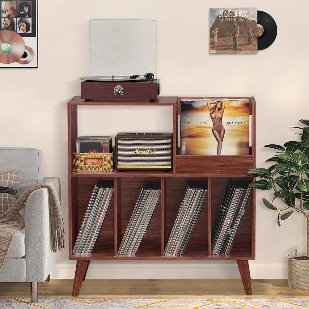 This record player stand is a dream for vinyl lovers! The sturdy wooden build holds up to 300 lbs, and the spacious storage fits over 300 records neatly. The retro design adds a classic touch to any room, while the wide partitions keep everything organized. Perfect for both style and function—highly recommend for any music enthusiast!