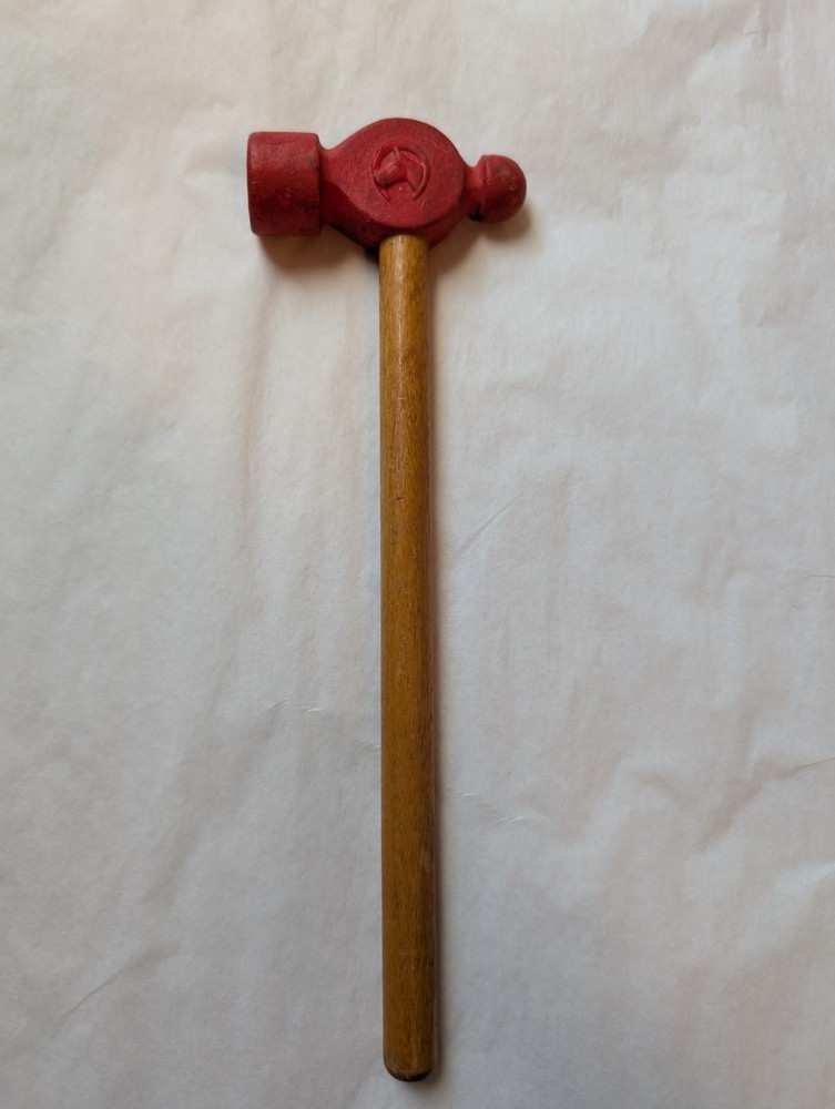 Vintage Auburn Rubber Toy Red Ball Peen Hammer with Wooden Handle This is a toy ball peen hammer The head is red rubber with a horse head and horse shoe design on it The handle is made of wood The hammer is 9.5 inches in length Used, see pictures for condition Ships via USPS