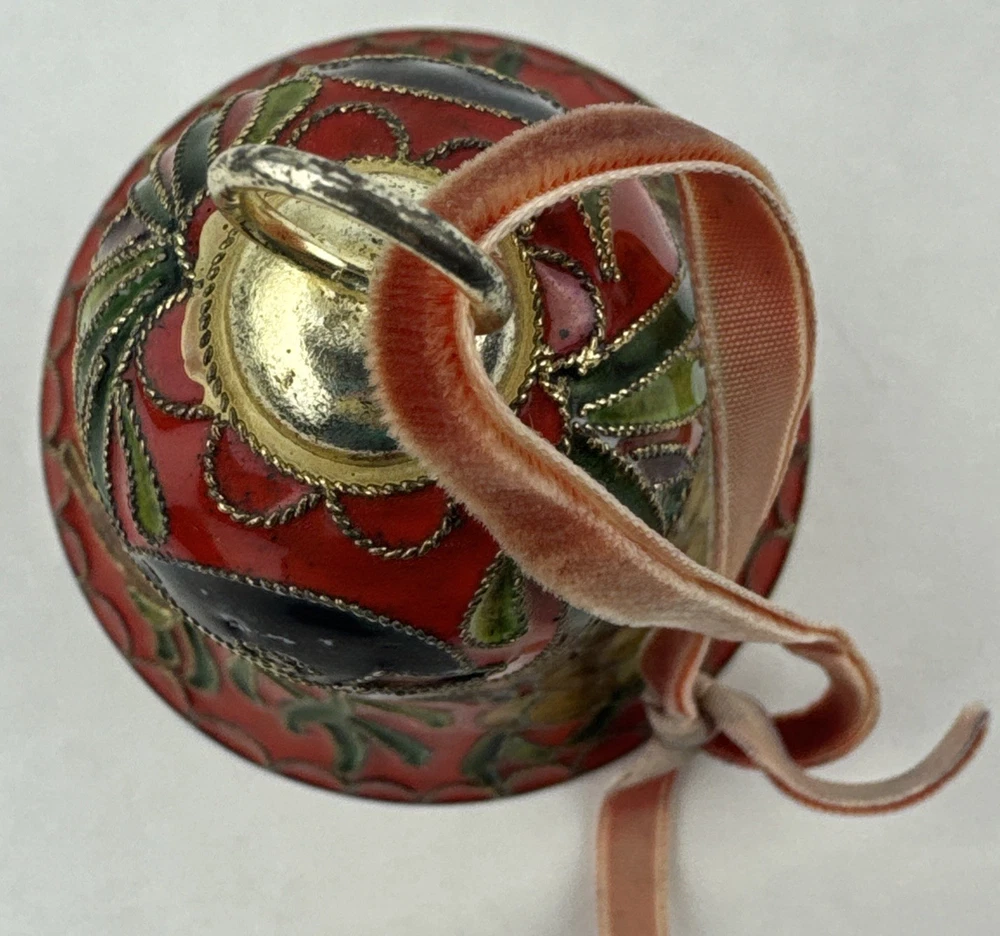 Vintage Red Enameled Cloisonne Bird Bell Floral Ornament