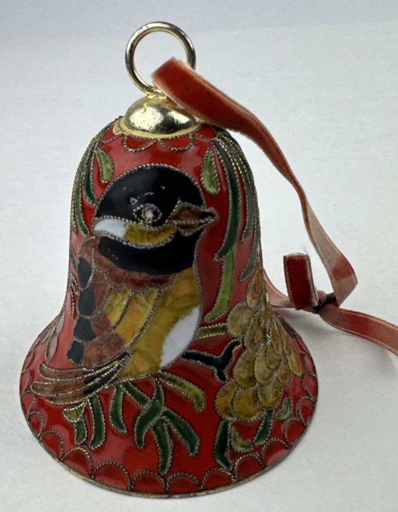 Vintage Cloisonne Bell Ornament Beautiful bird pattern. Small scratches on one of the bird's head. Ribbon is faded.