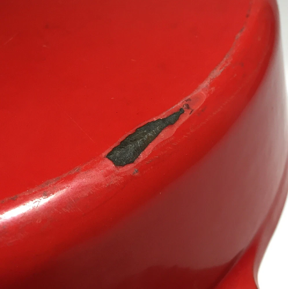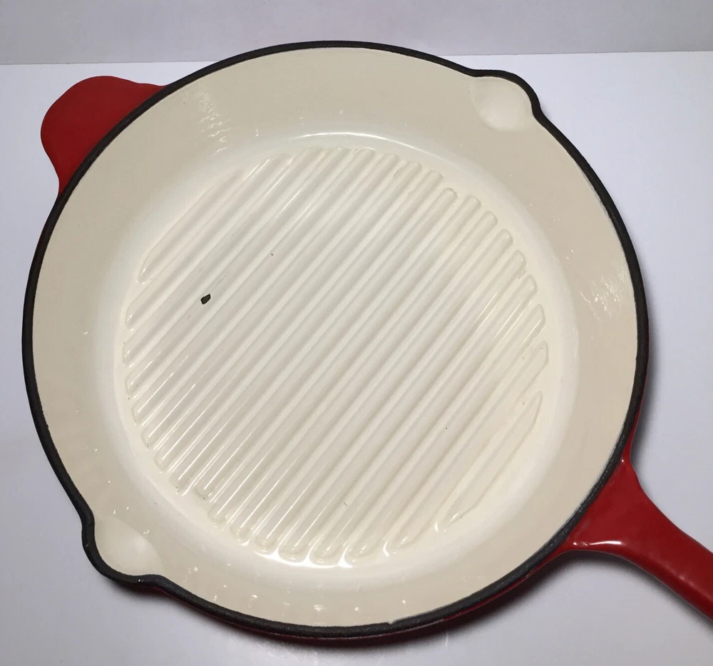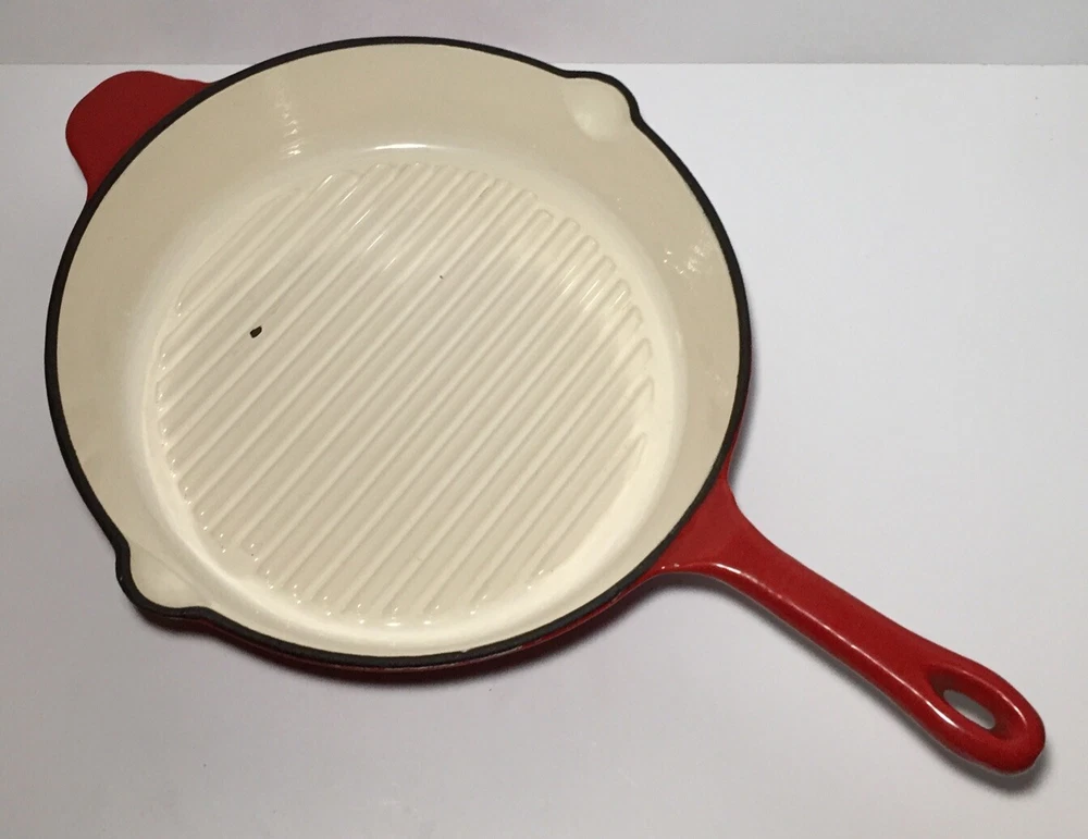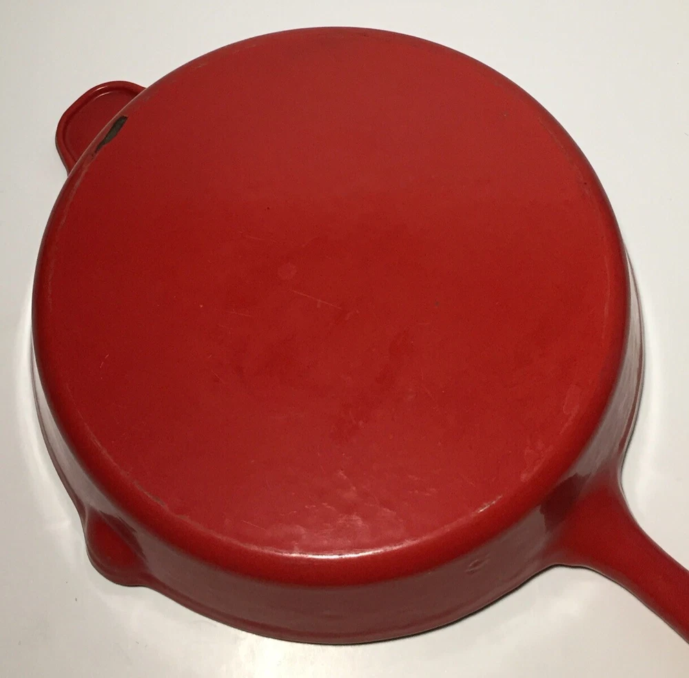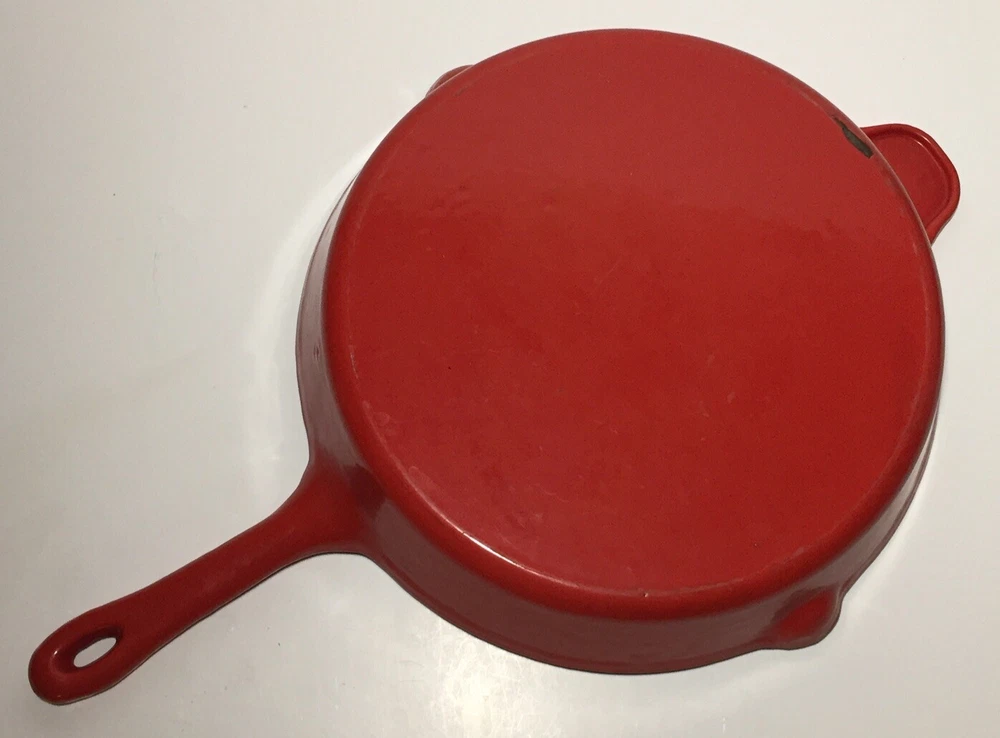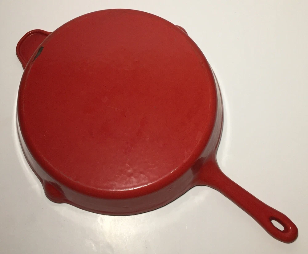 Vintage Red Enameled Ribbed 12” Cast Iron Spouted Skillet. The skillet has a few flakes in the enamel. Other than the flakes it’s in overall good condition. Please feel free to ask any questions. The item will ship out safely and securely the same or next business day.