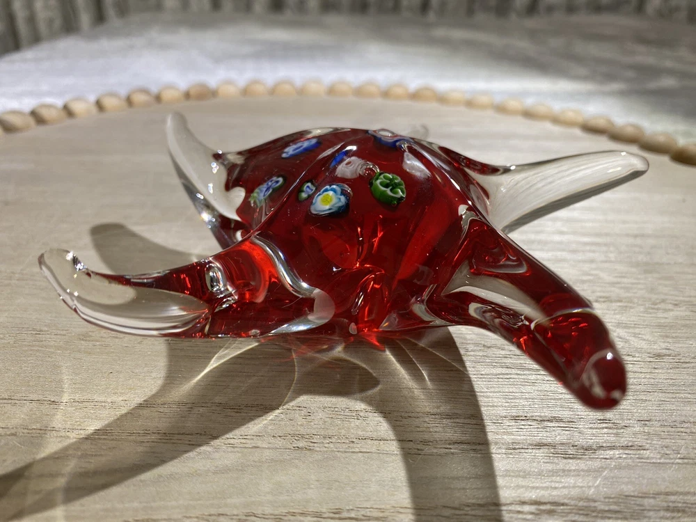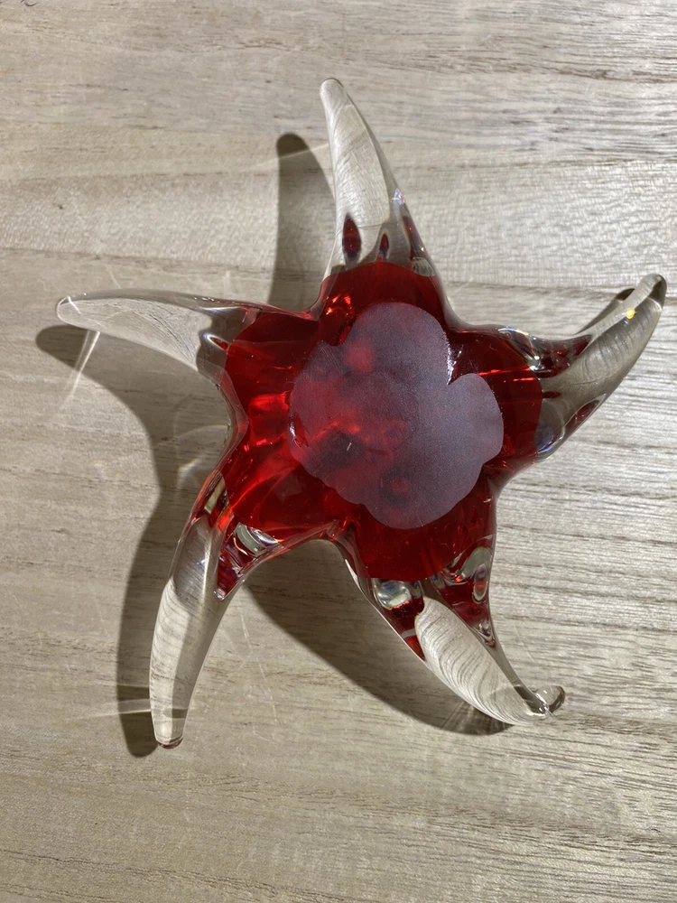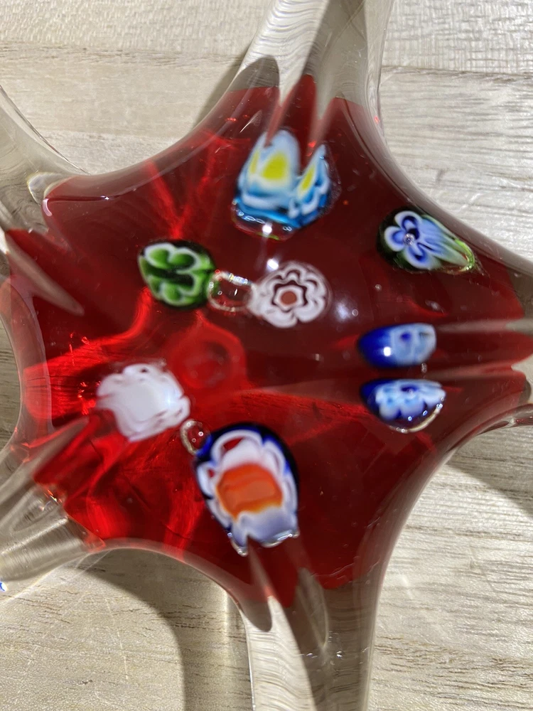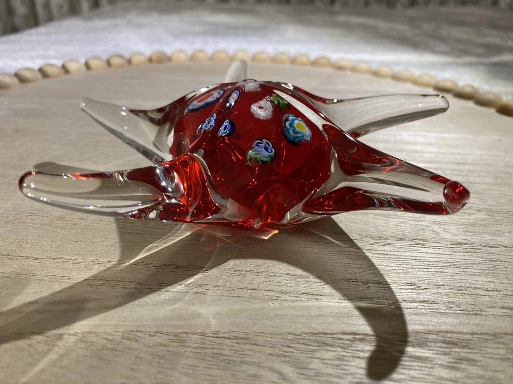 This item is a vintage starfish figurine, acquired in the early 2000's. Specifically, it is a Millefiori-style, glass starfish in clear and red, with multicolor flowers. "Millefiori" translates from Italian to "thousand flowers", and refers to the Murrina technique of slicing canes of glass to expose transverse patterns. In Millefiori, the slices of layered glass exposes a flowerlike design. Measurements Height: 2 in Width / Length (at widest / longest point): 6.325 in Weight: 13.8 oz These measurements are Seller's best approximations. Vintage. Pre-owned and in excellent condition. No flaws observed. Please see all photos. SHIPPING: All items will be weighed, photographed and/or video-recorded while item is prepared for shipment. Shipping of items will always prioritize the care and safety of the item, but at times will use recyclable materials (to include boxes and packaging materials). DISCLAIMER: All photographs provided do not use filters with any intent to alter or improve the appearance or condition of the item. All items are inspected carefully and flaws are photographed and presented as transparently as possible to The Buyer. All measurements provided are done to the best of the ability by The Seller. If you have any further questions pertaining to the description of this item, please contact The Seller BEFORE purchasing or placing an offer.