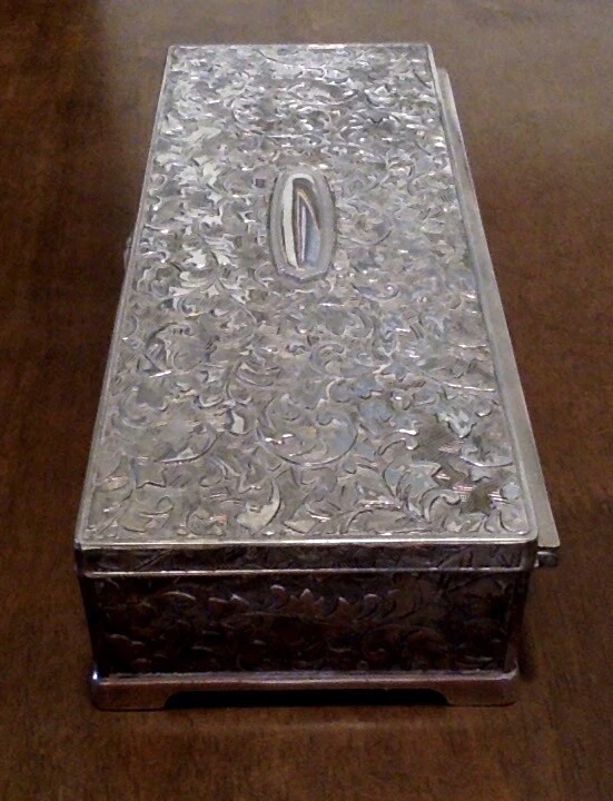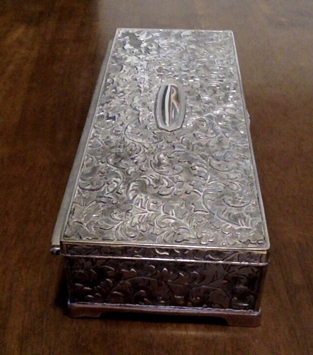 Excellent vintage condition (circa 1990s) lid opens and closes smoothly, Beautiful red velvet interior, ornate silver plated exterior. Made by Godinger, this box has a plaque area in the center of the lid surface decoration that may be engraved with your initials. Ships via UPS ground, carefully packed. Thanks for looking, and enjoy!