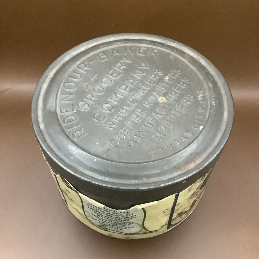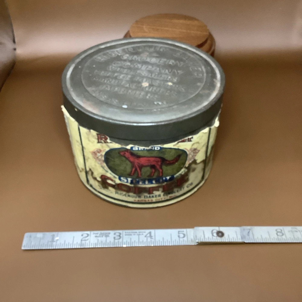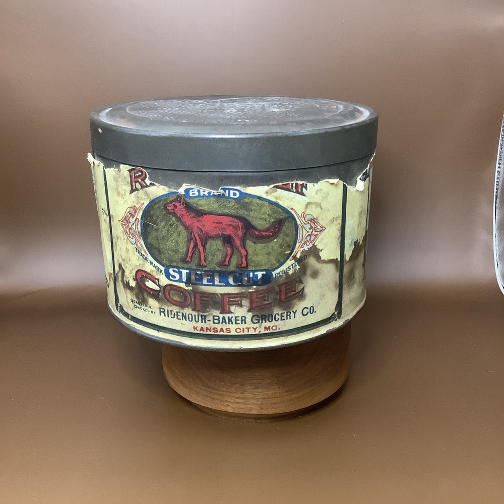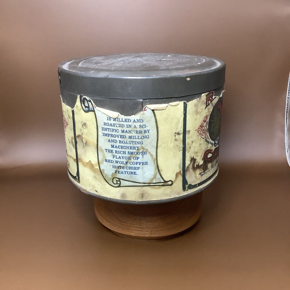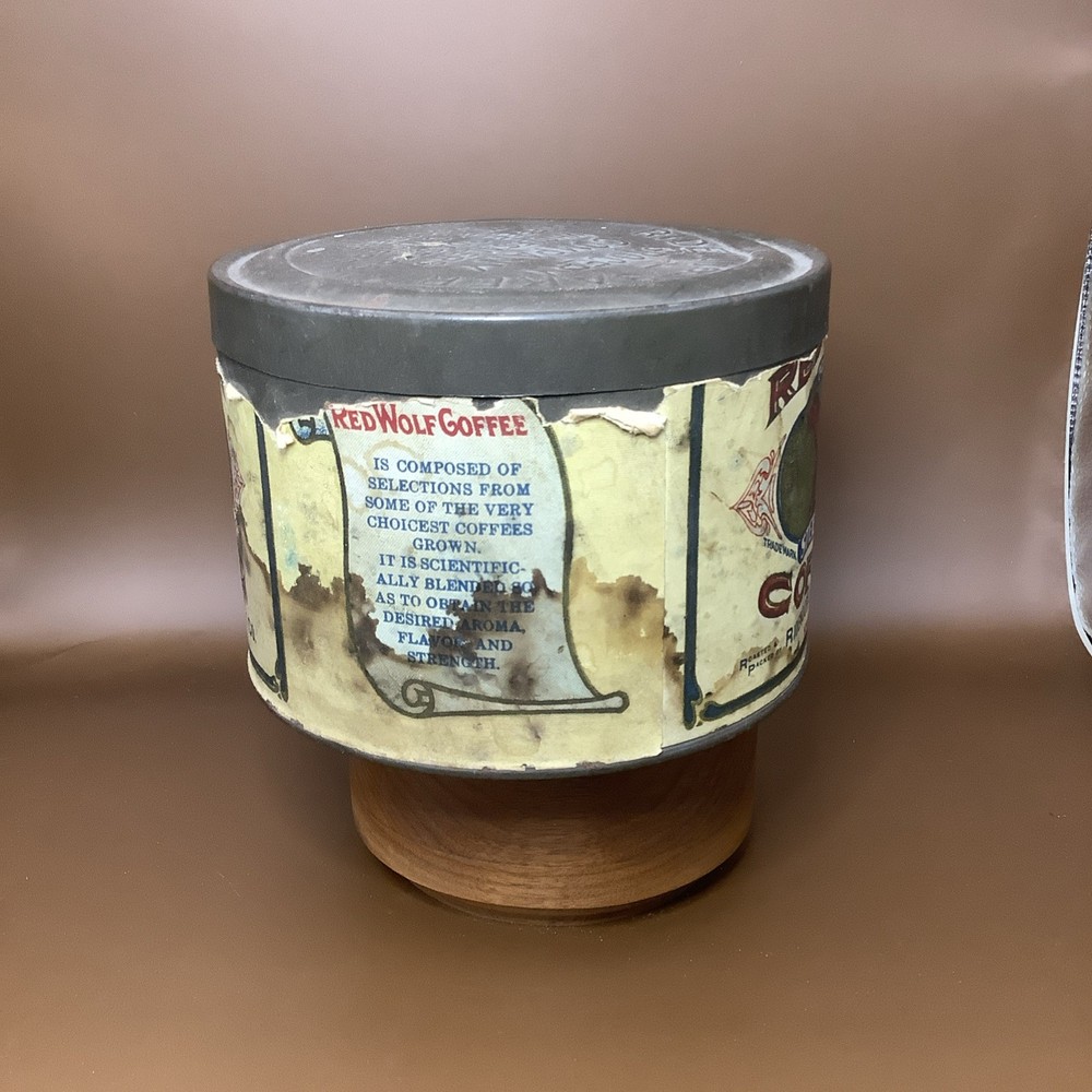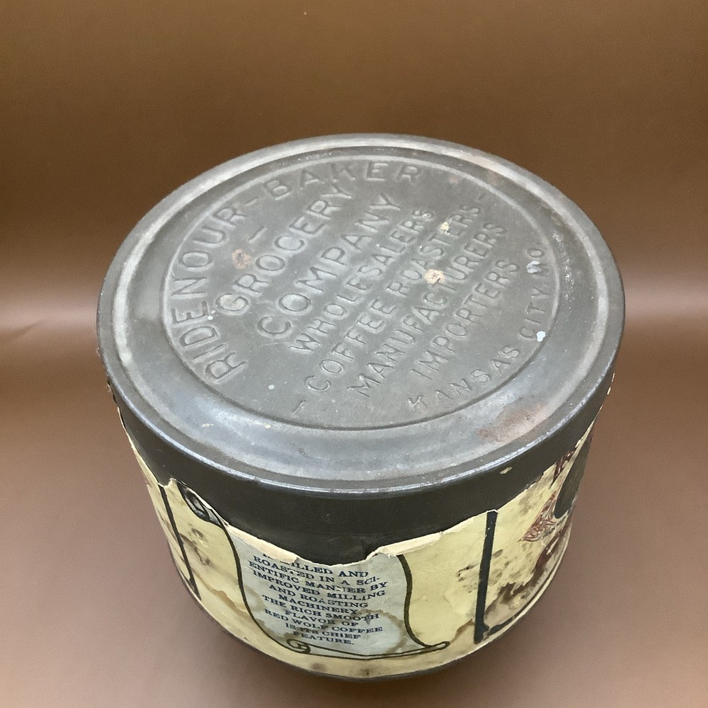 Vintage Red Wolf Steel Cut Coffe Tin Kansas City Missouri Early Paper Label. See pics. Paper label not perfect but still a really great graphic. Still a very cool and hard to find piece.