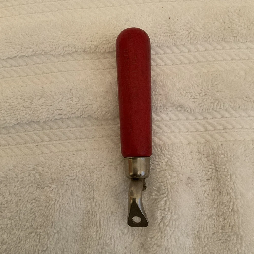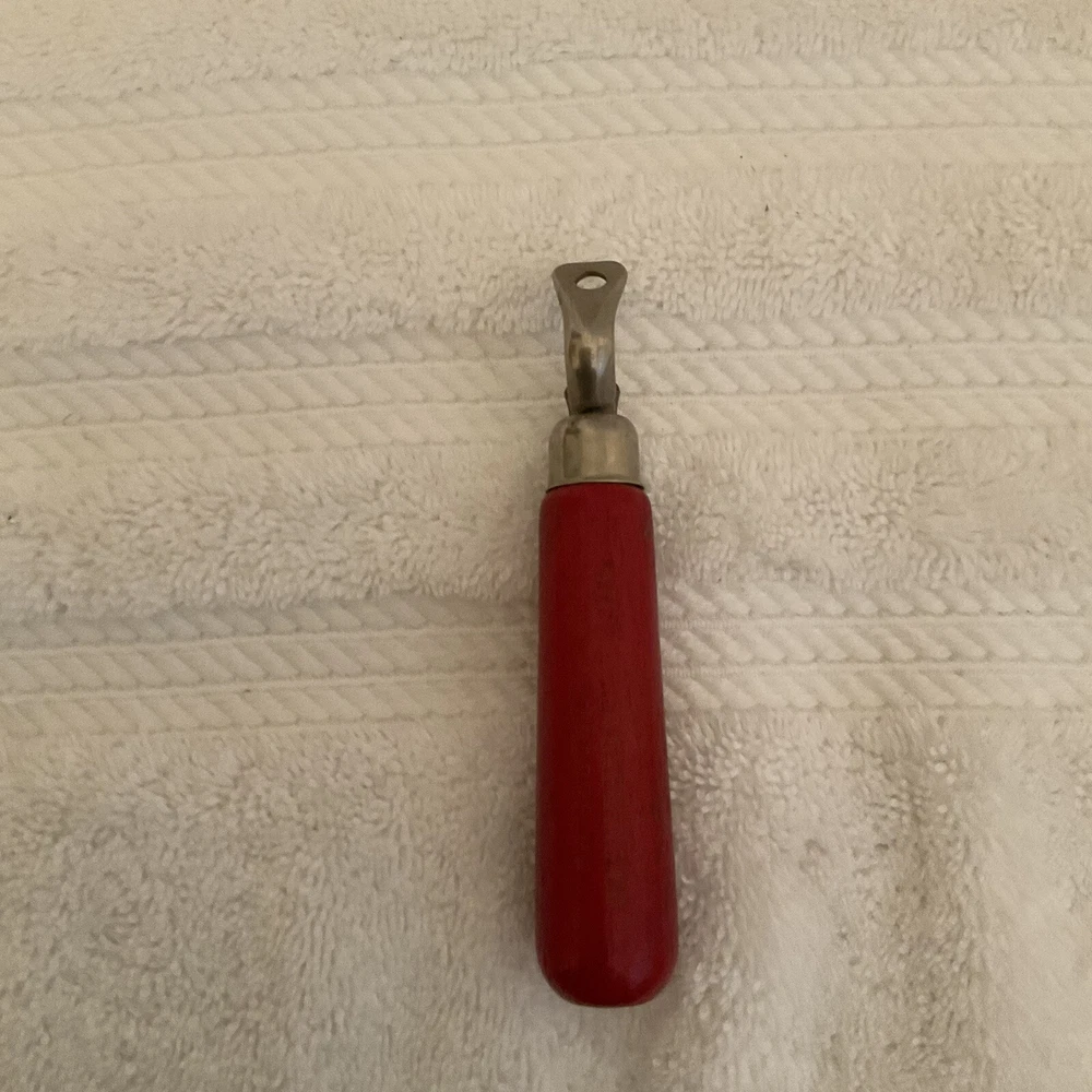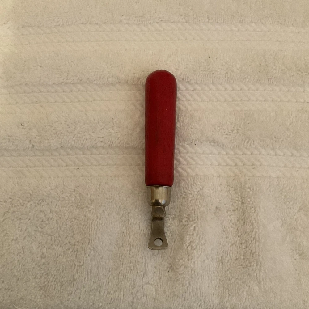 This vintage beer bottle opener features a red wood handle, making it a charming addition to any Breweriana collection. The opener is designed as a traditional handheld device, perfect for easily opening beer bottles.