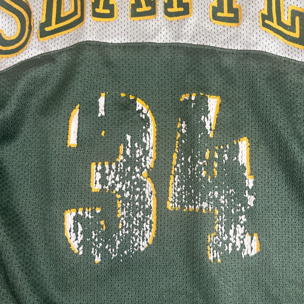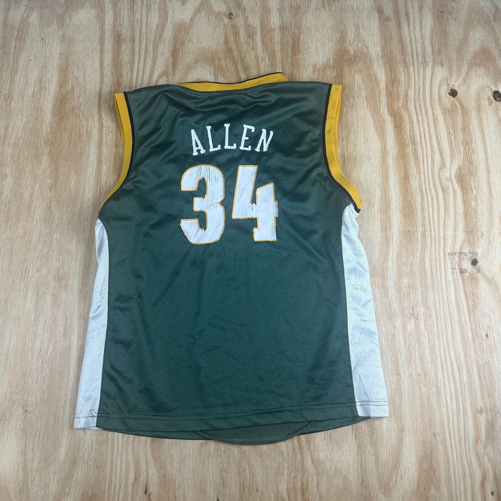 Color: Green League: National Basketball Association (NBA) Product: Jersey Pre & Post Season: Regular Season Size: L Sport: Basketball Team: Seattle Supersonics Player: Ray Allen Capacity: 8 oz Gender: Unisex Children Country/Region of Manufacture: Russian Federation Seller Notes: “Vintage jersey faded graphic print” Brand: Reebok